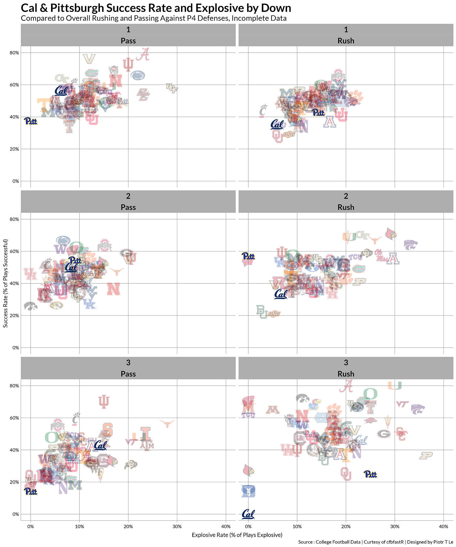 The Cal defense put Pitt’s passing game to the sword on 1st and 3rd downs. Keeping the overall offense inert never breaking past the median on explosive plays. Cal offense on the flipside tried it’s damnest to waste the defensive performance with an especially putrid spread of statistics on running the ball.