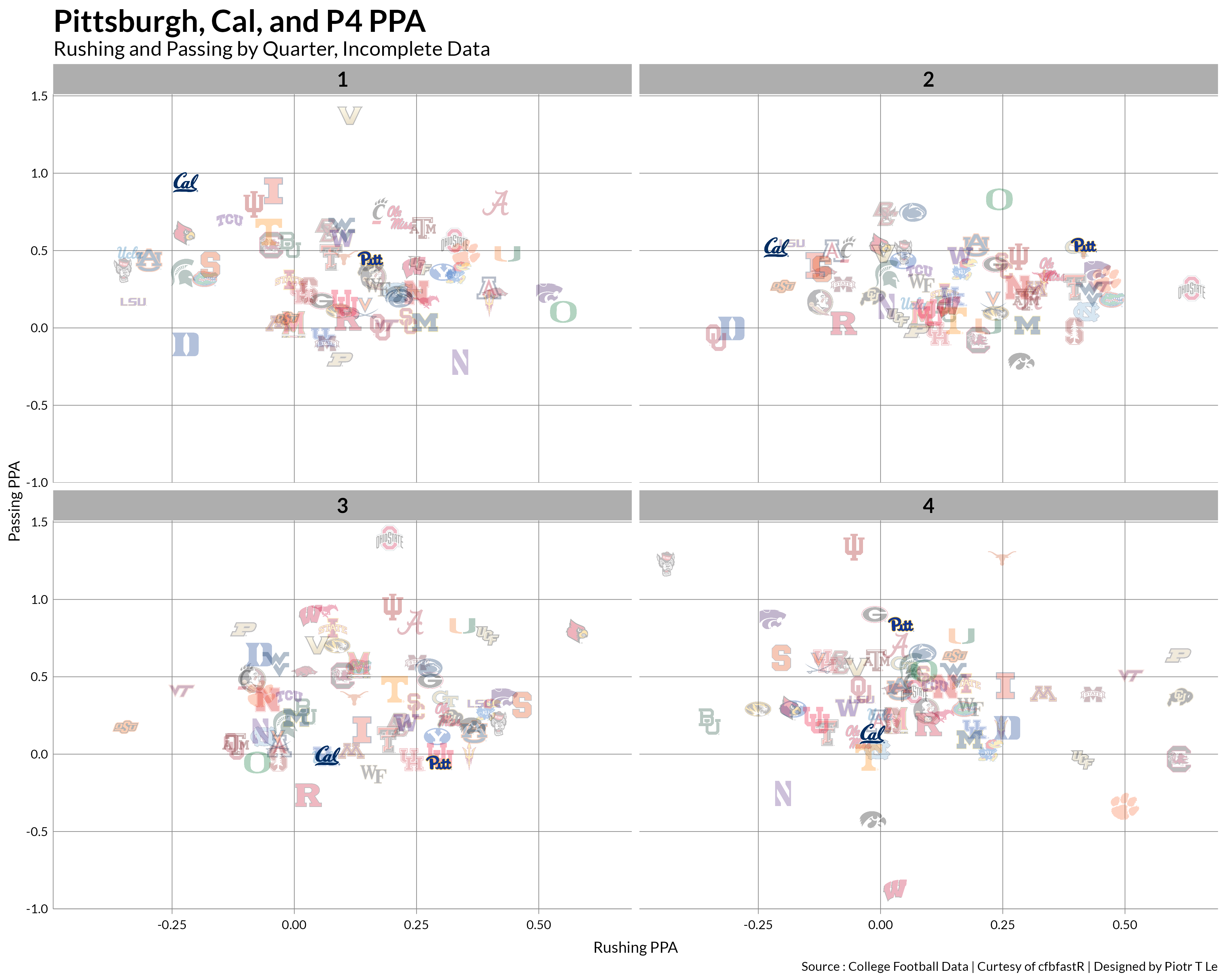 Only in the 3rd quarter did the Cal offense run the ball and did not lost PPA on a rushing play. The passing game was the only functioning element of the offense and that onlt lasted the first half of the game only to regress into irrellavance in the second half with a brief yet insignificant on average stint by Jack Endries to try to save the game.