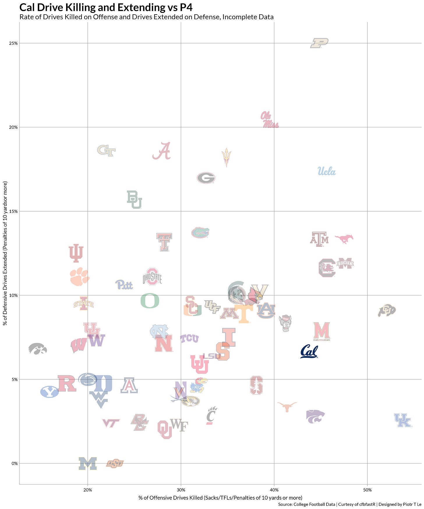 On the flitside the Cal defense has been quite good at not comitting 10+ yard penalties on given drives. I know Wilcox would rather have the number dip into the sub 5% era but being where we are it is not too bad.