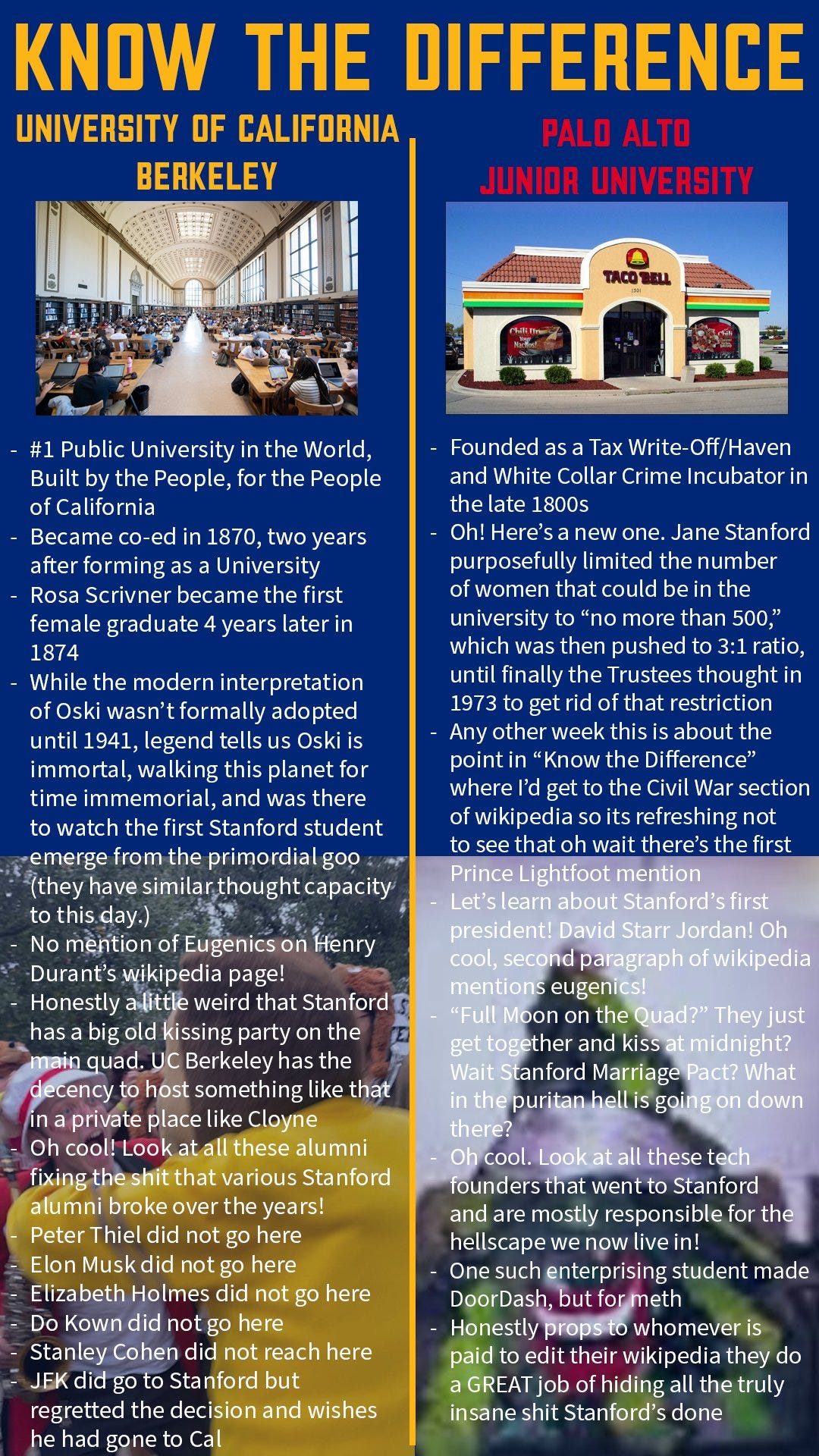 Berkeley and Stanford are very similar universities. The same way a slice of pizza from Cheeseboard has to do with Taco Bell’s bean burrito.
