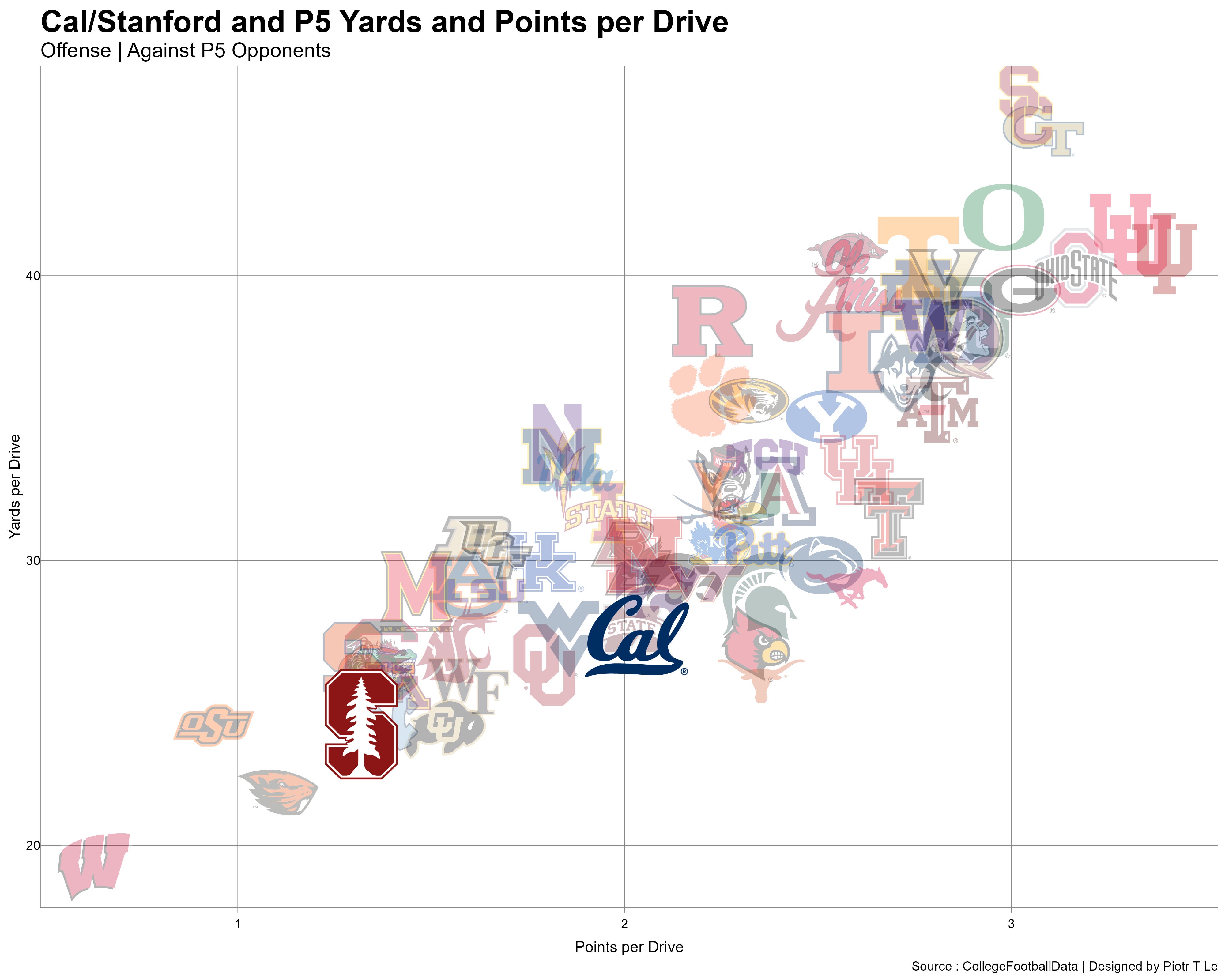 Cal has been able to do what Stanford has not been able to: in spite of gaining roughly the same amount of yards per drive, Cal is able to nearly double the amount of points! Efficiency when scoring opportunities appear + explosive passing game that makes up for the lackluster rushing success rates.
