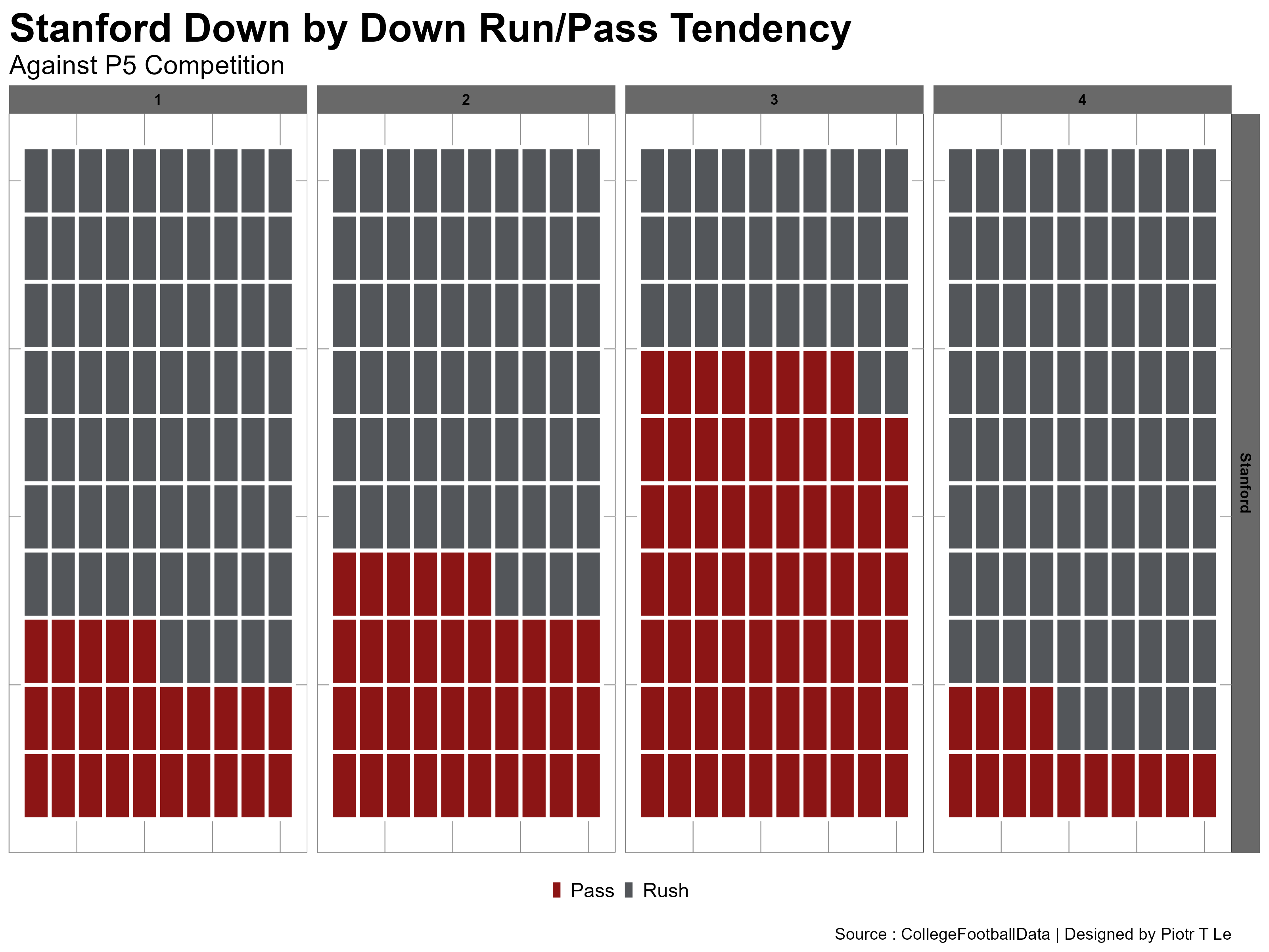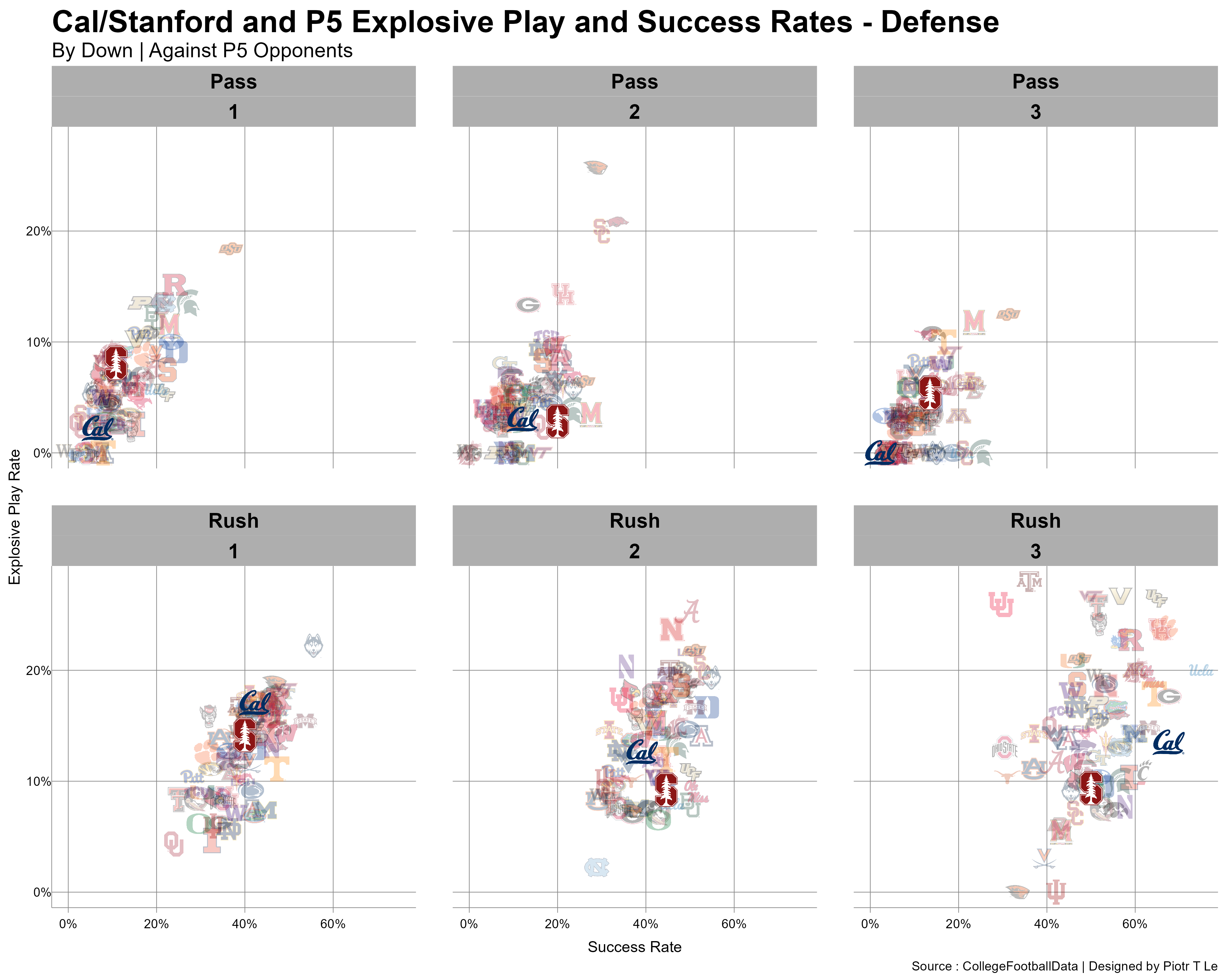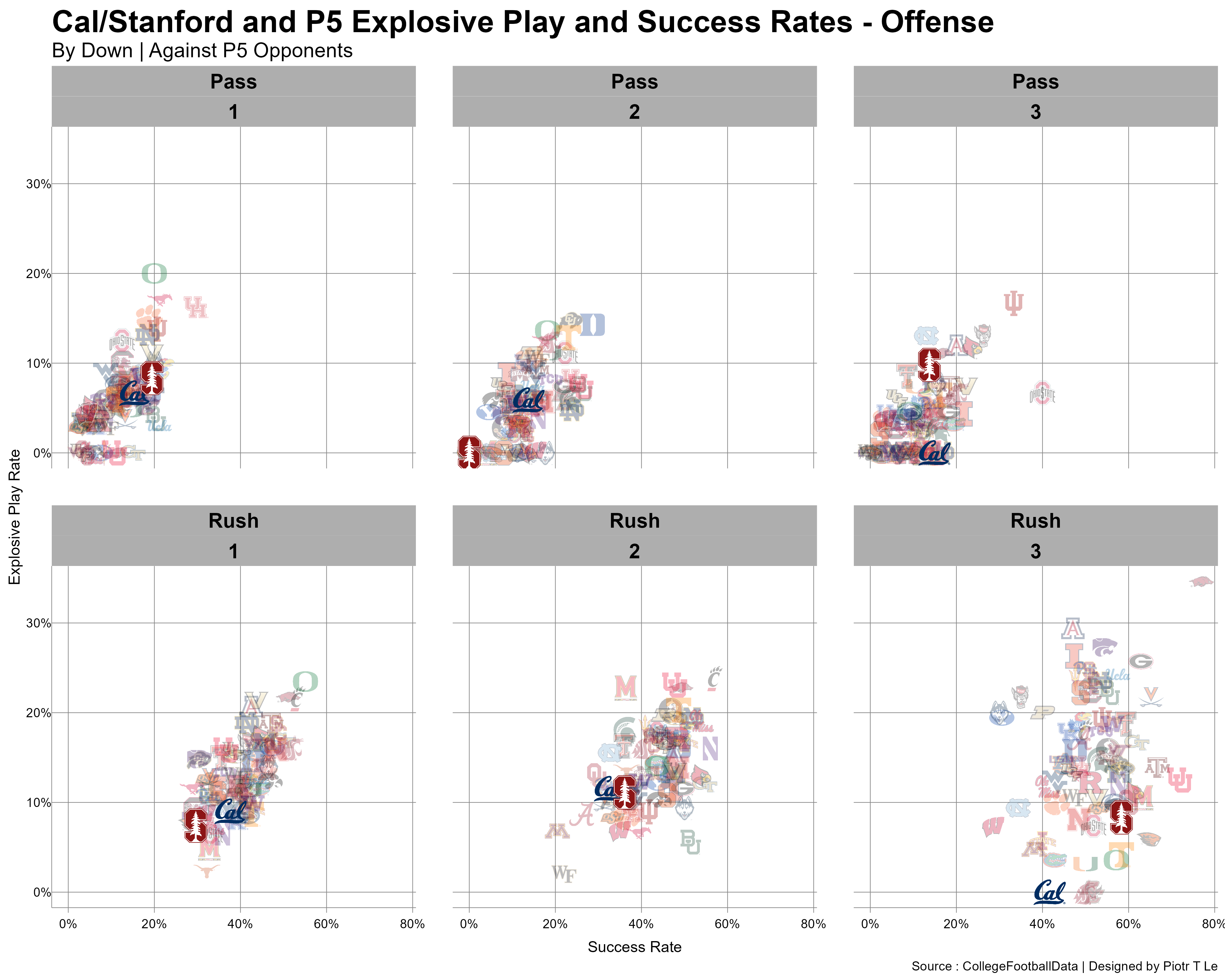 The run pass tendencies are very similar especially on 1st down where both teams try to run the ball on 1st downs. Likewise on 3rd down the passing game becomes the feature, likely due to the fact that both of the teams average 3rd downs are 6.9 for Cal and 6.55 for Stanford, both very bad.