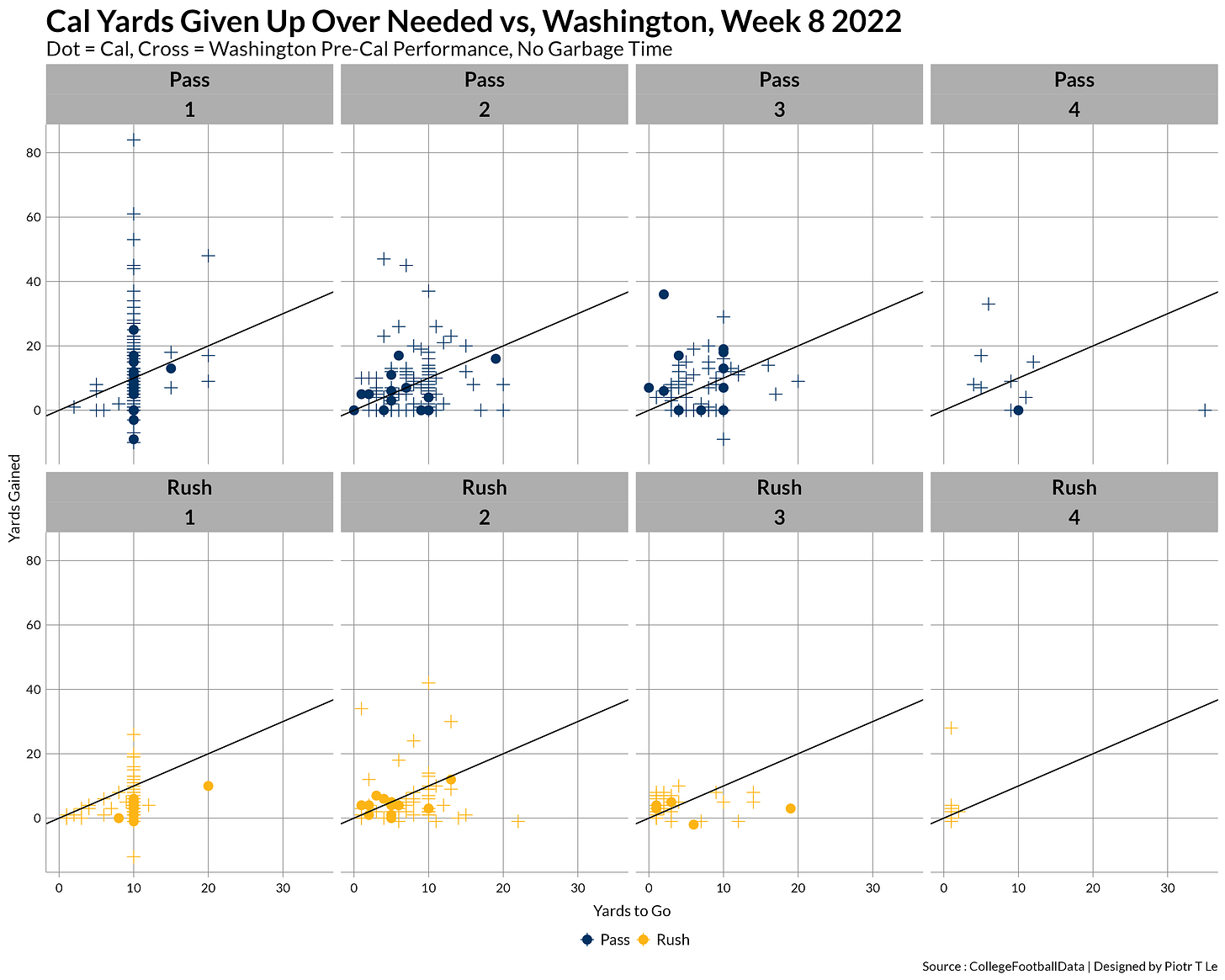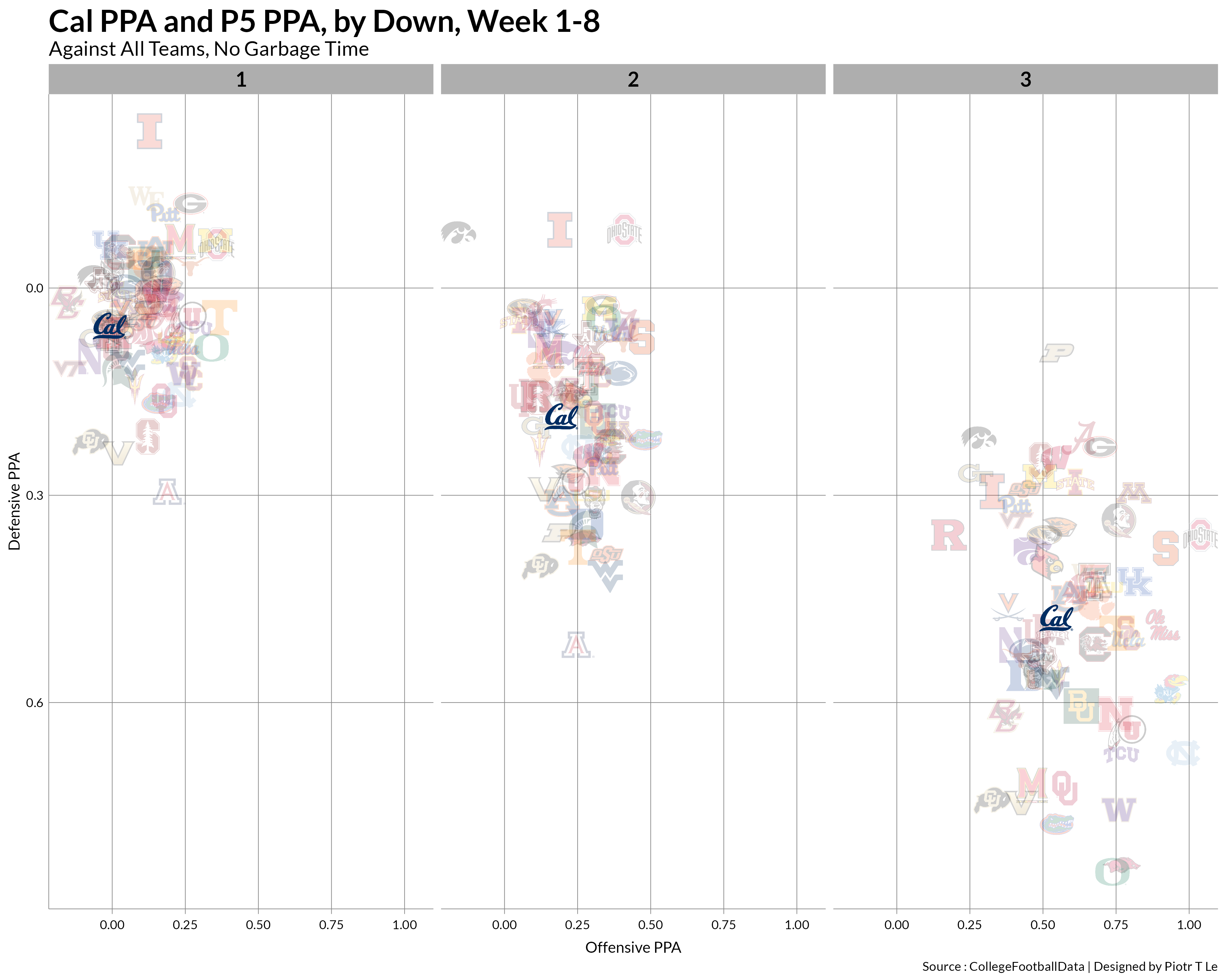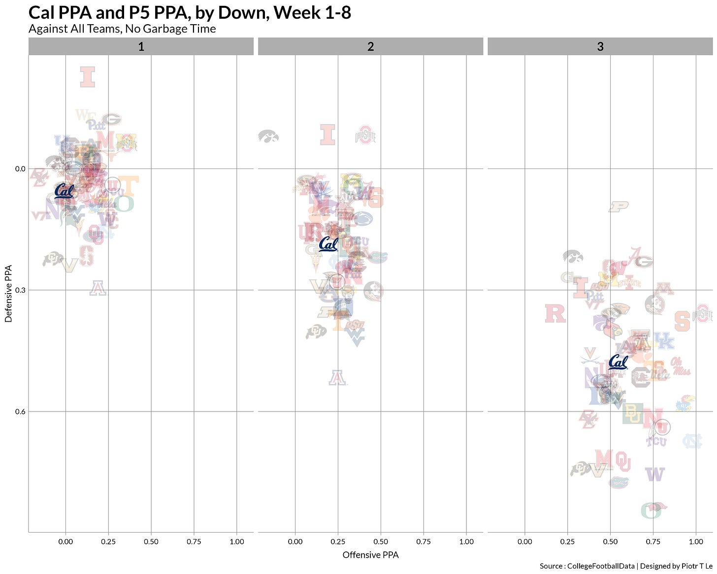 Cal has a 0 EPA on 1st downs… And then are below average on 2nd down and then have to go hard for 3rd down. The defense on the other hand is doing yeoman’s work on early downs but 3rd down defense remains a lot to be desired.