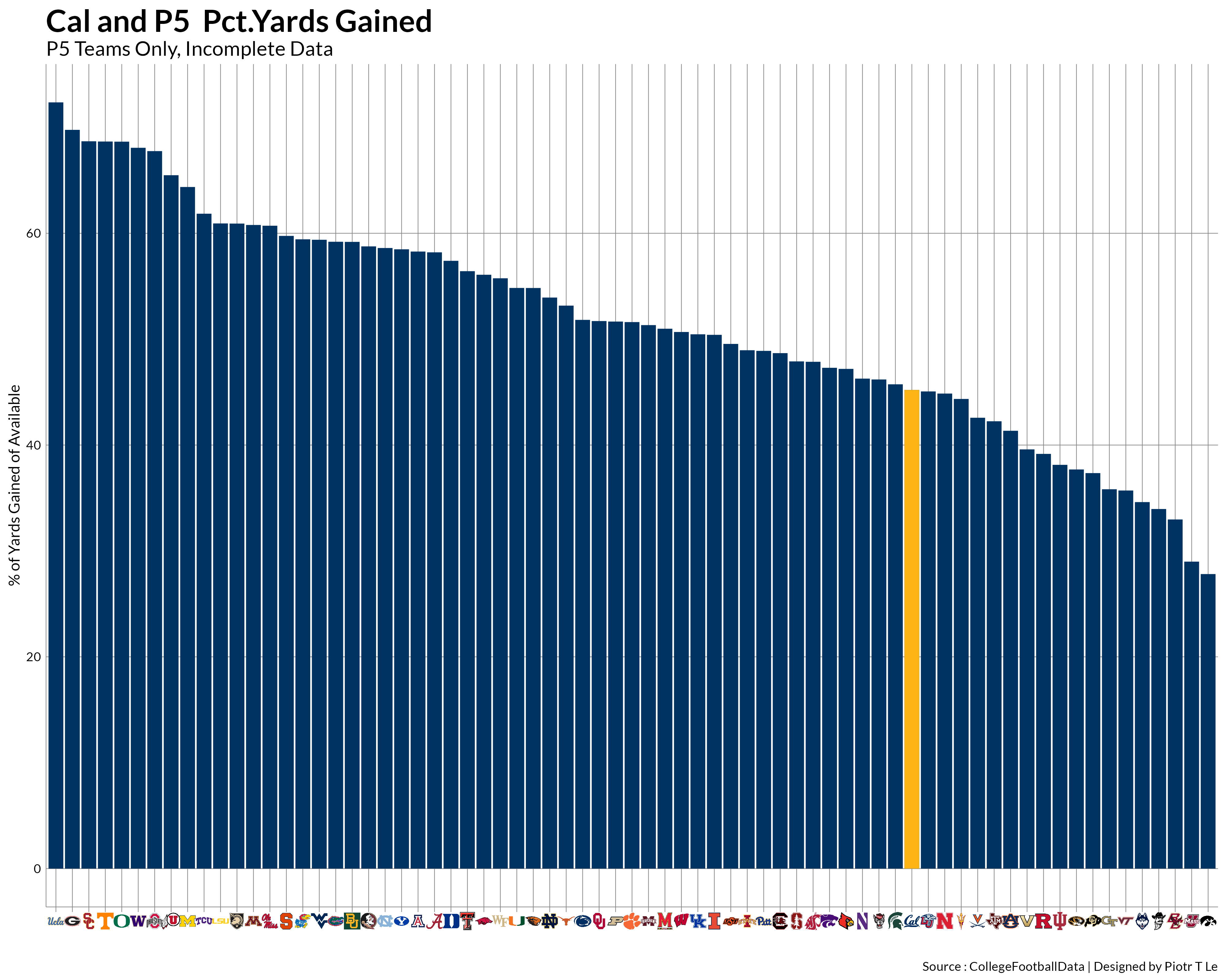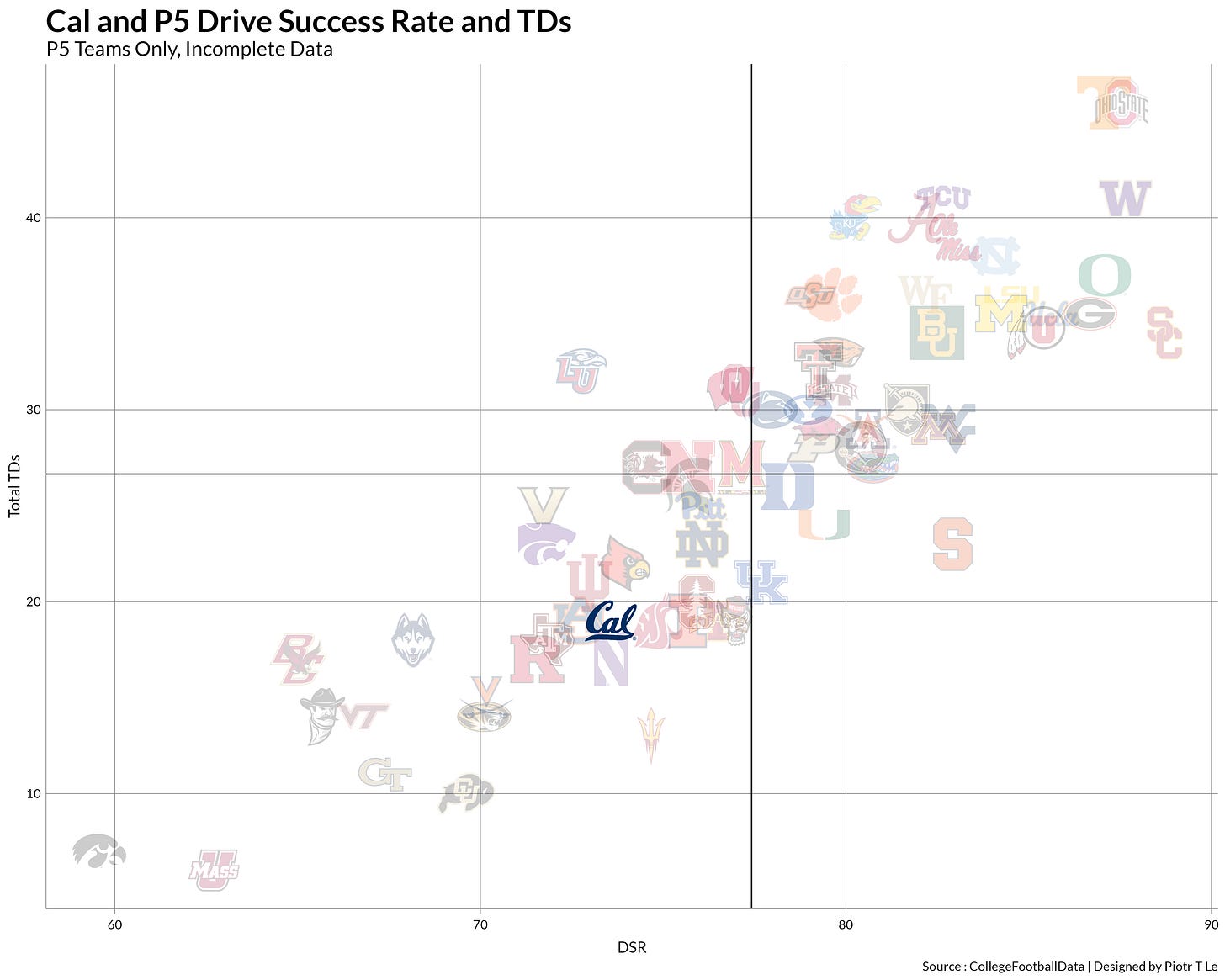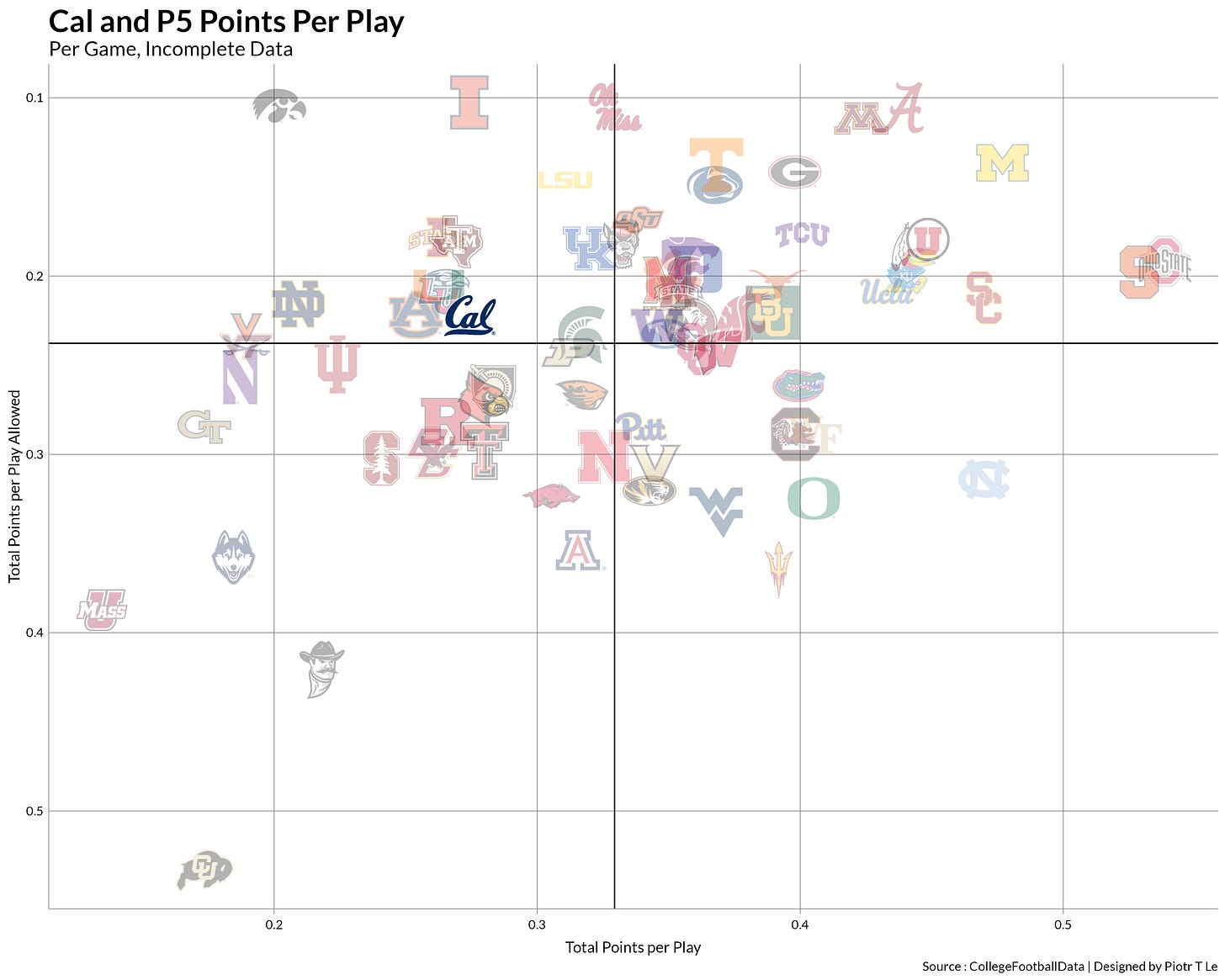 The Meaning of Cal football is mired in the muck of mediocrity. We’re just above average on offense, and comfortable below average on offense. However, the differential between where Cal is and where it needs to be in order to support this offense is the gap between Cal and Illinois which would demand our defense to halve it’s allowed points per play efficiency.