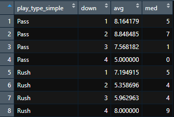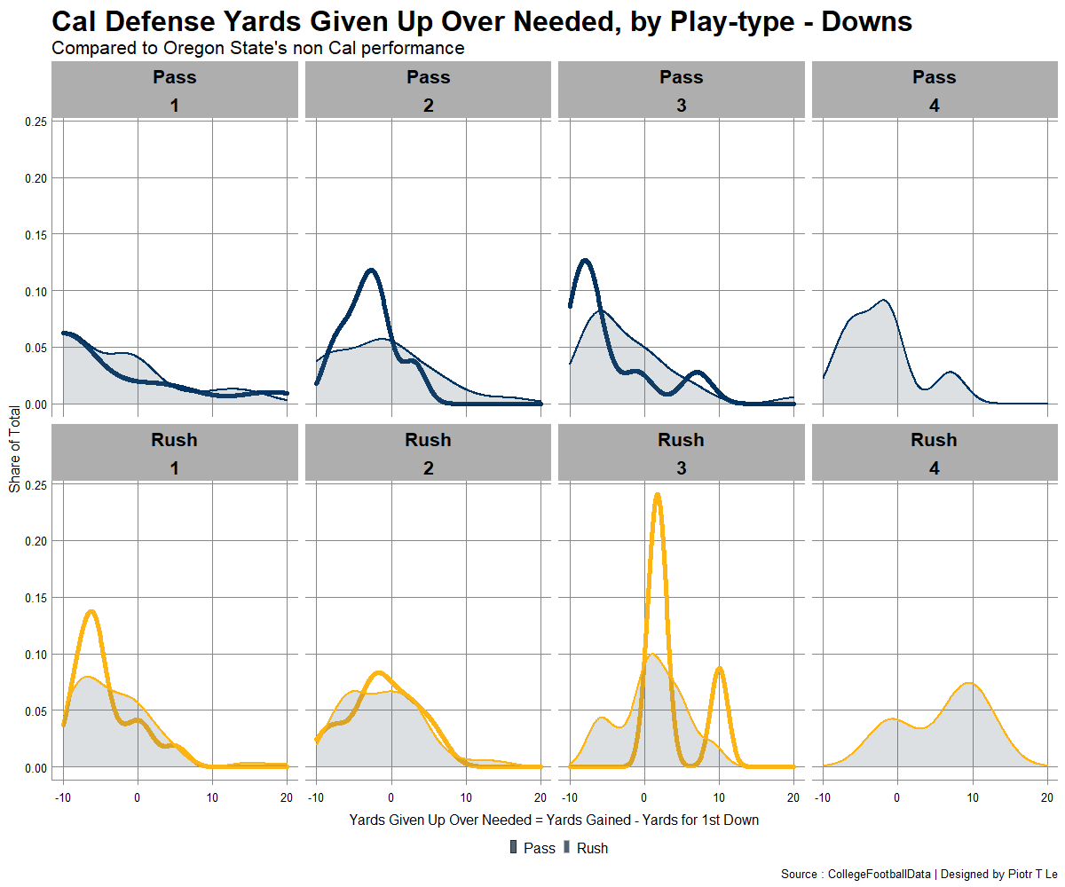 Even if the Oregon State offense avg. higher on 1st down passing against Cal vs. rest of the field, the lower median means that the distribution is skewed towards just a handful of explosive outliers and was mostly shut down as well.