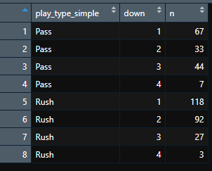 We can see an evident 60/40 1st down run/pass split and a 75/25(!) run/pass split on 2nd down. This ex-ante expectation was proven true looking at the splits at the game here Oregon State insisted on their run on early downs.