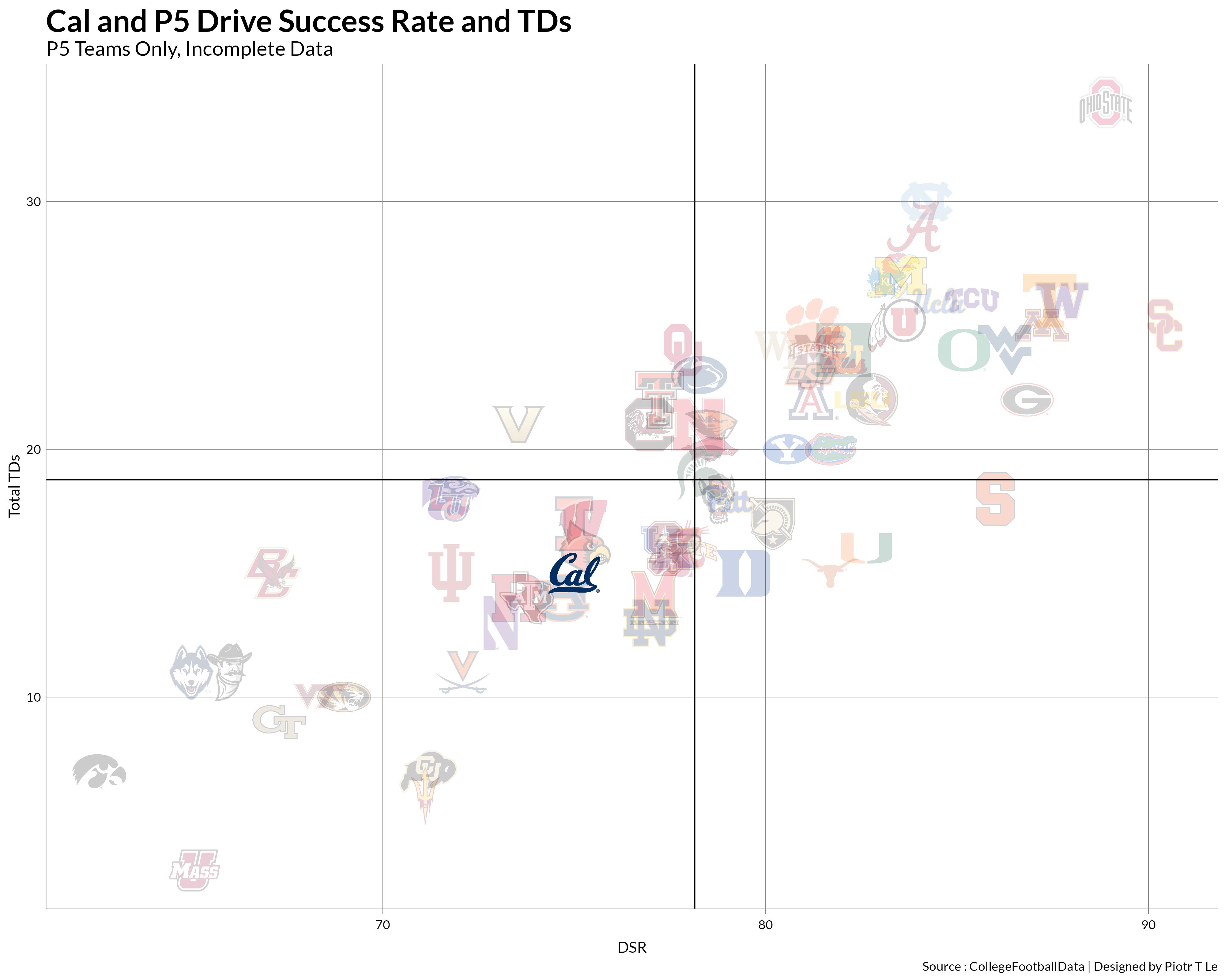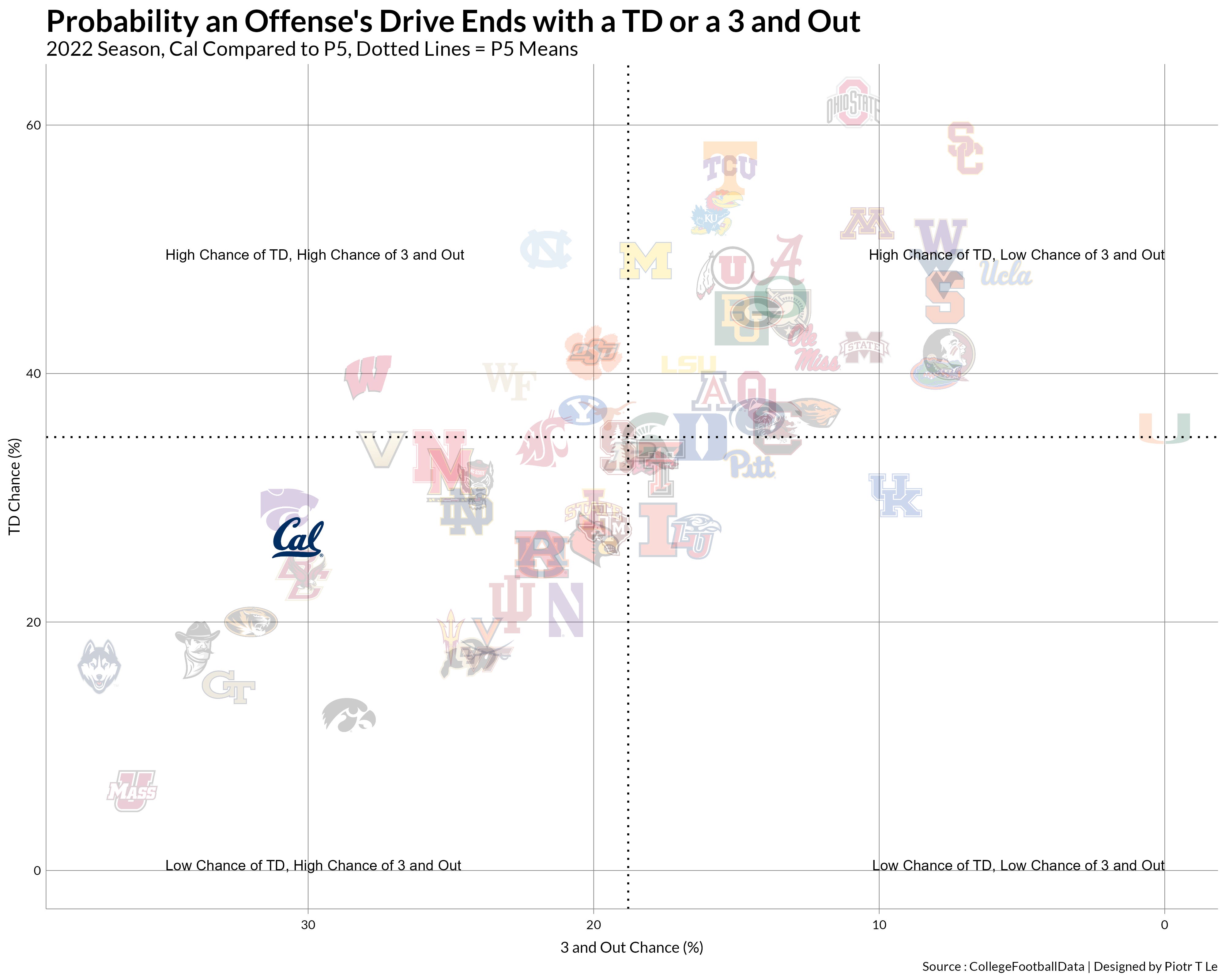 Here it is, the chart depicting the issue with the Cal offense. It is not just that we don’t get TDs, but we’re struggling to get the ball past 10 yards once we gain possession of the ball. we’re in the illustrious company of Kansas State, Boston College, Mizzou, and Iowa. Every time we touch the ball there is a 30% chance that we’re going nowhere fast.