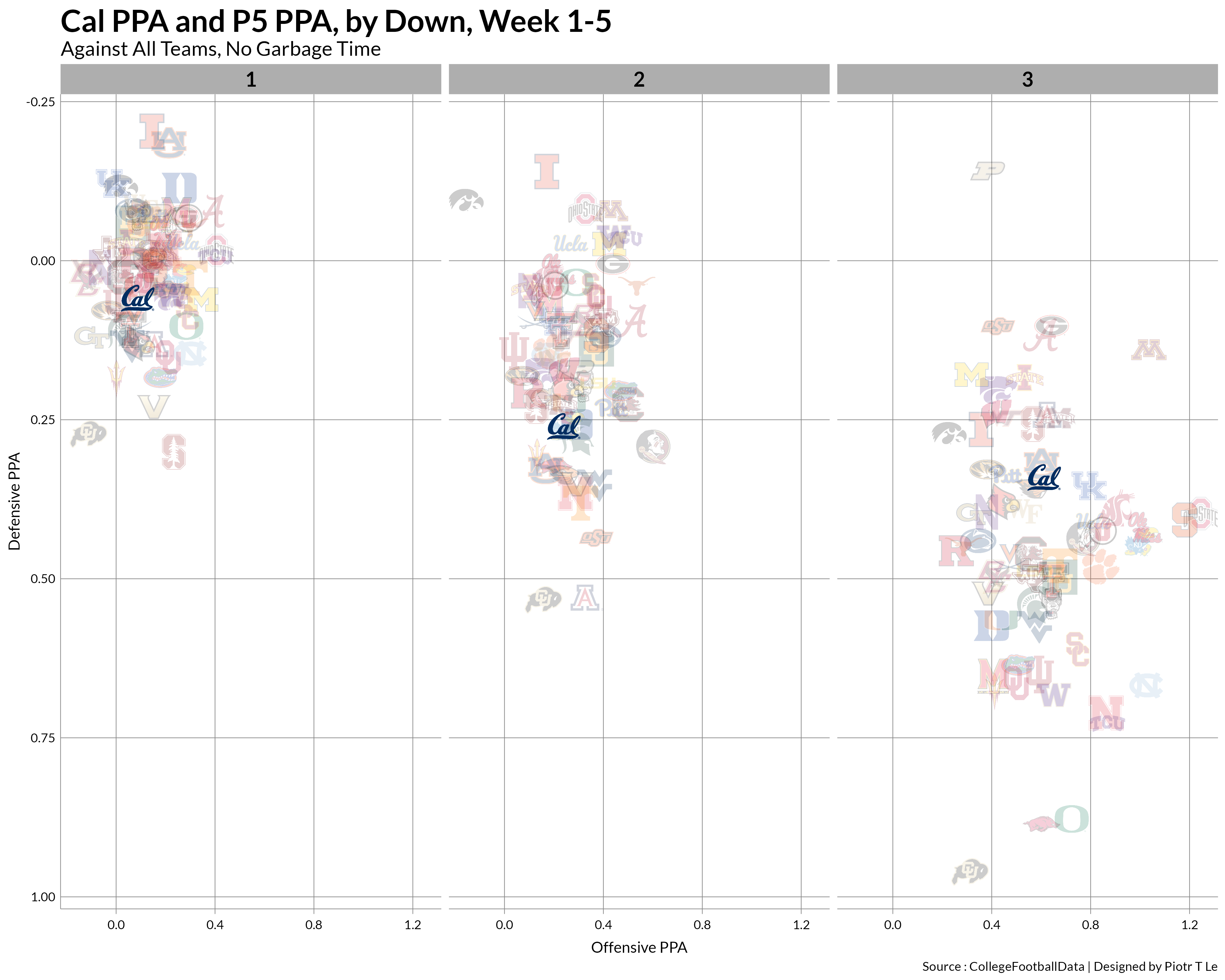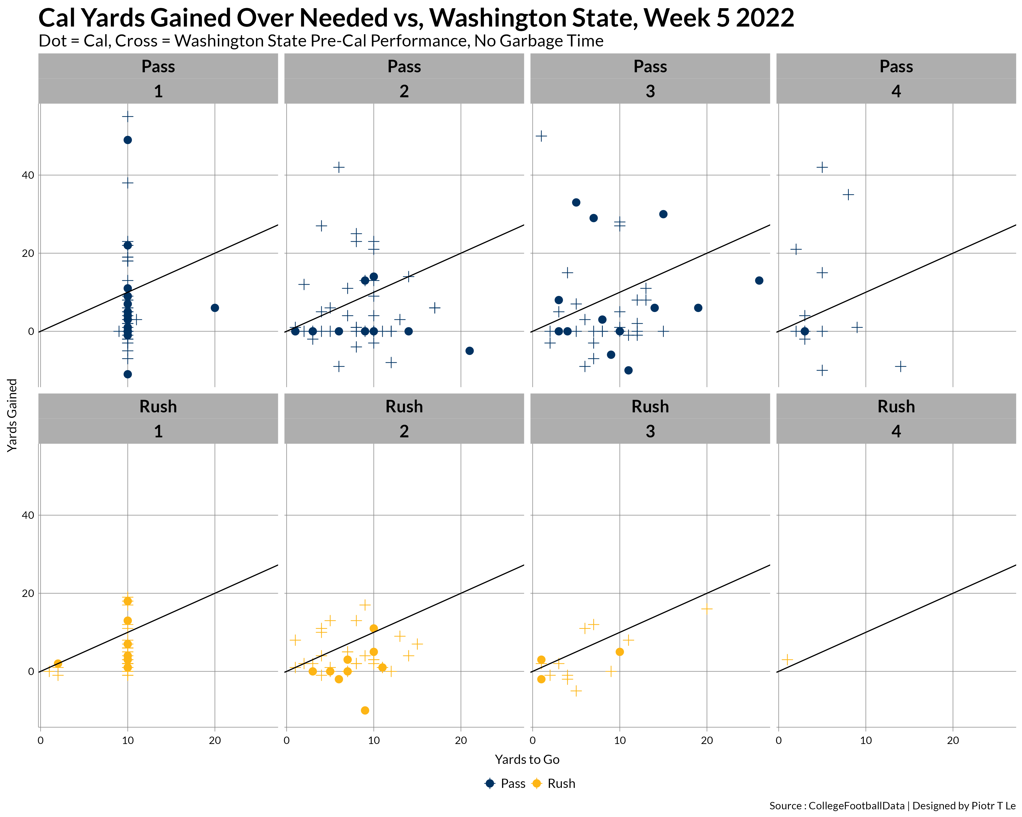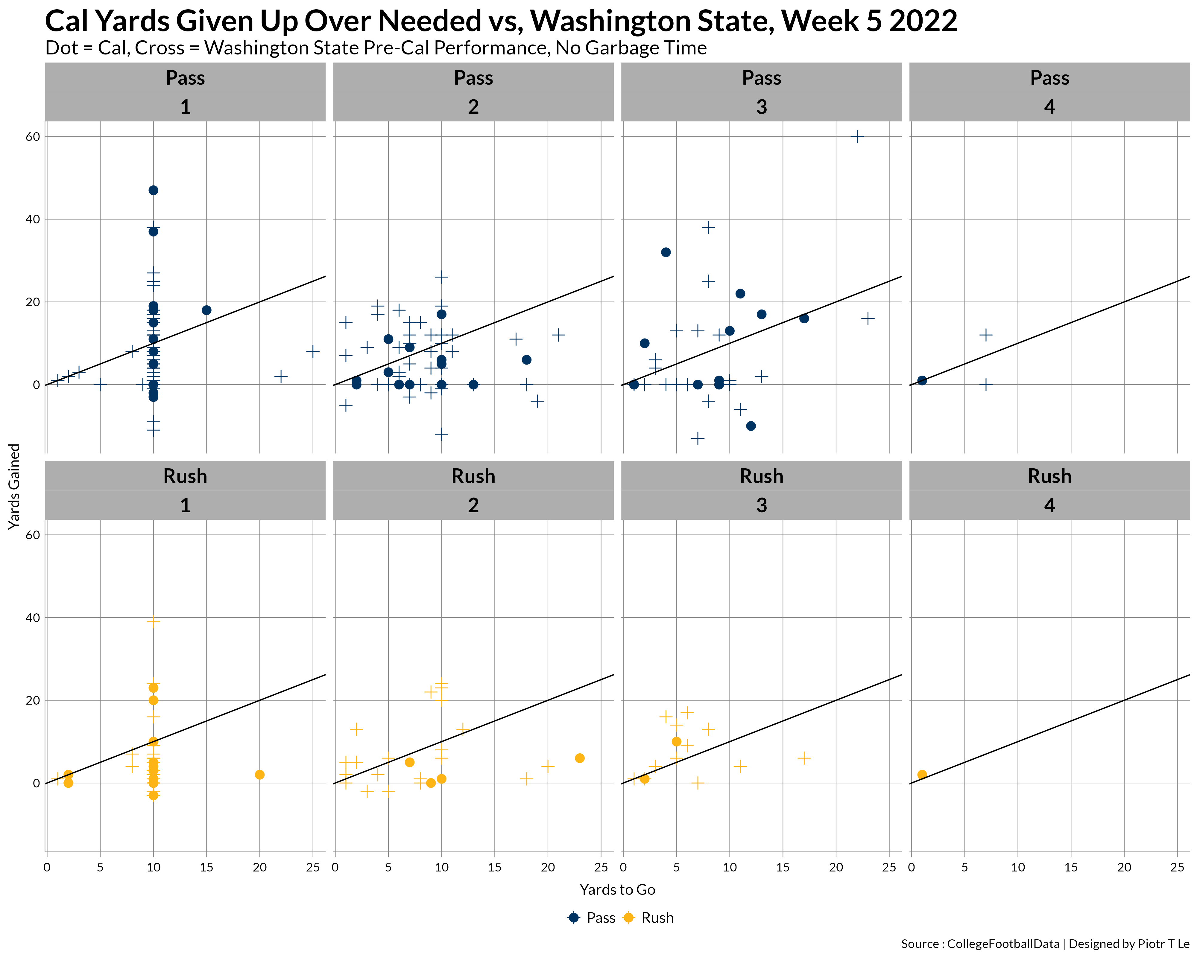 Go Bearly down the field. There are a lot of issues with the offense especially in trying to convert downs. On the flip side the WSU game revealed a lot of issues in the pass defense on 3rd downs despite having a favorable look for the defense (3rd and long). Let’s look at some data and charts!