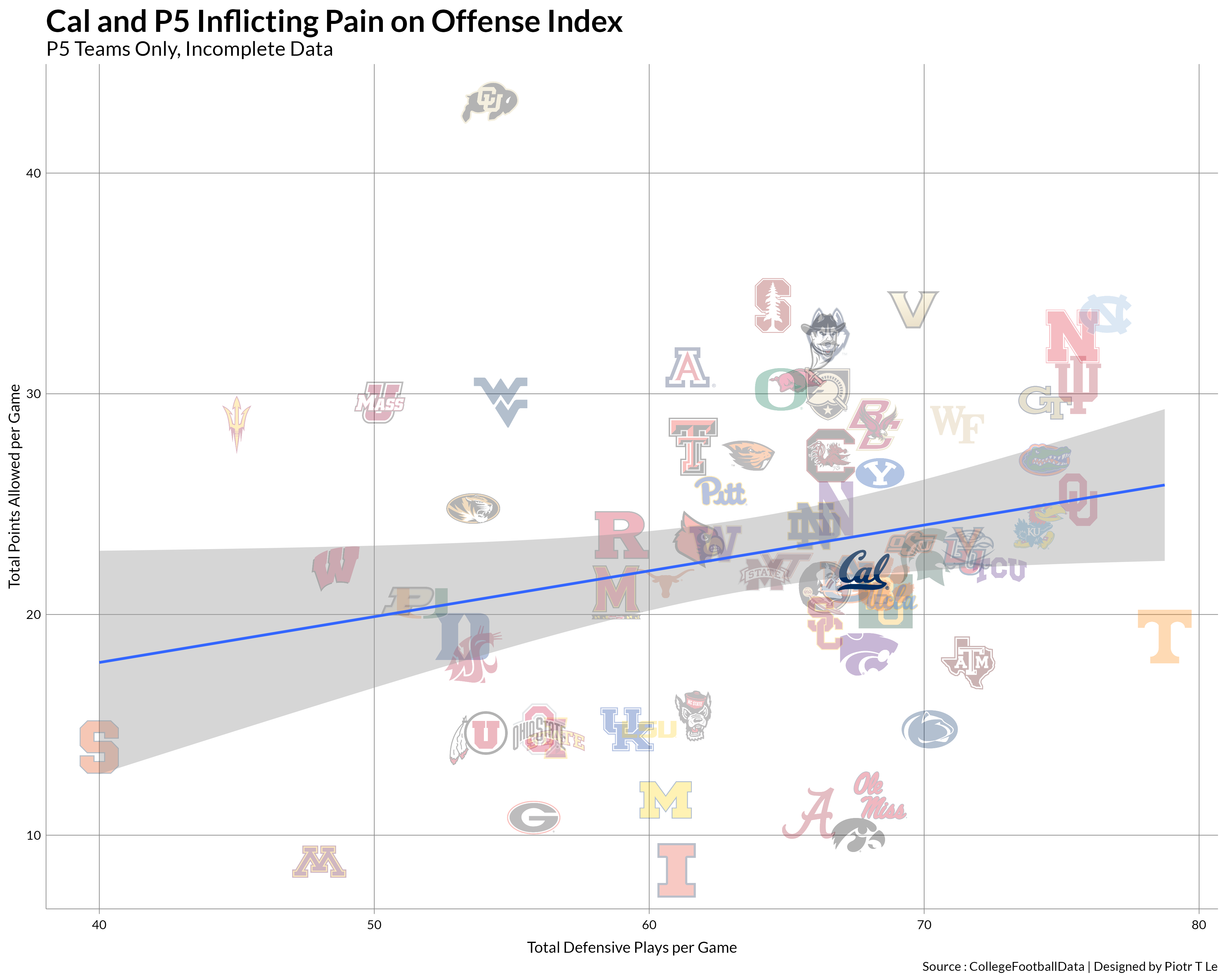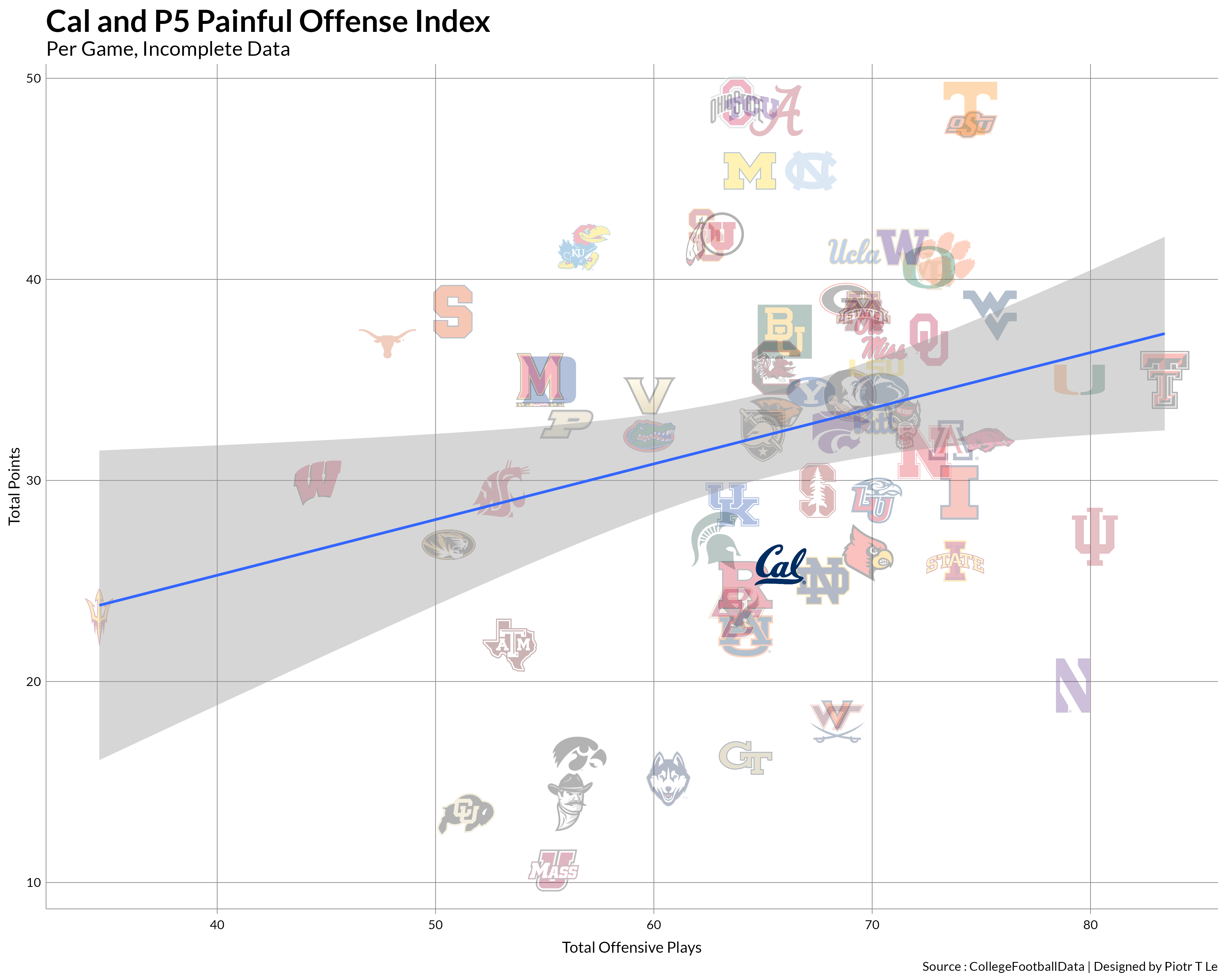 On the flip side, the Cal defense has been keeping opposing offenses nearly in the painful area to watch. The WSU/Arizona games have been moving the Cal logo closer to the regression line and into the confidence interval.