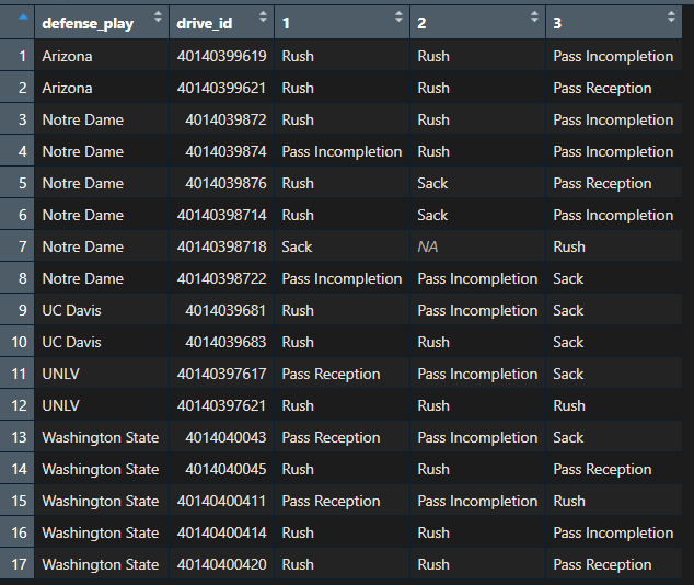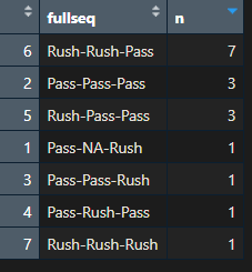 Below is the sequence of plays that lead to those 3 and outs. With the predominant sequence being the dreaded Rush-Rush-Pass sequence.