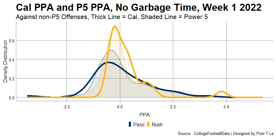 On defense, Cal remained in line with its comparators with a slight tilt to the right side on the rushing defense side, note that the lower the defensive PPA the better. Most P5 teams didn’t try to do anything too exotic during the game. We did a good job of keeping the Davis passing offense right around average, the only bump being on the run defense with the 60-yard TD.