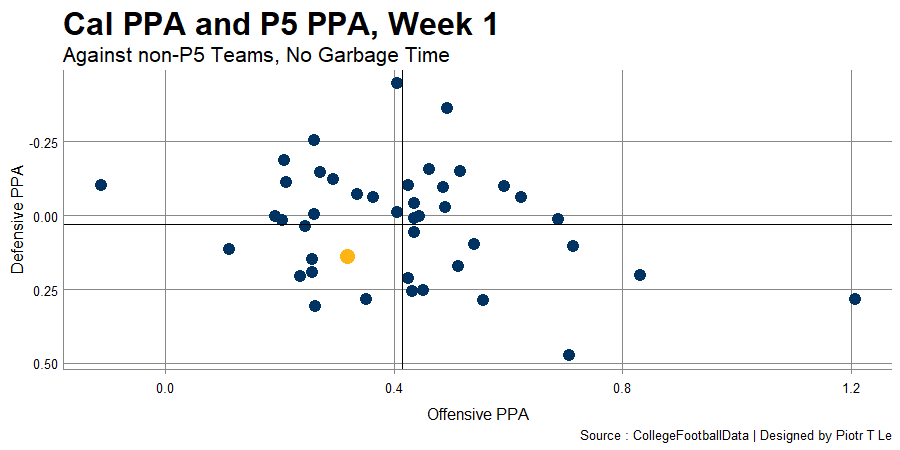 What this chart presents is the distribution of all 44 P5 vs non-P5 games that happened in week 1. Cal is the golden dot in the lower-left-hand side quadrant were teams that were below average on both offense and defense.