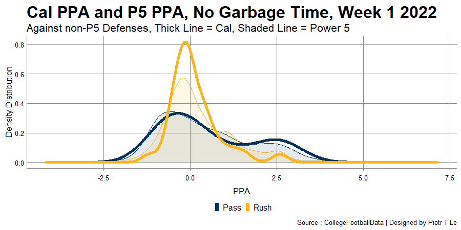 Without the 1st quarter, Cal’s offense averaged a PPA of 0.43 which would’ve put us just above the average line and ~ 19th in the nation. Were the 1st quarter jitters the reason for the poor start? Last year Cal would start red hot, scoring on nearly half of the drives in Q1 only to falter in Q3 (which if you see above is what kinda happened with a dip from 0.62 to 0.22).