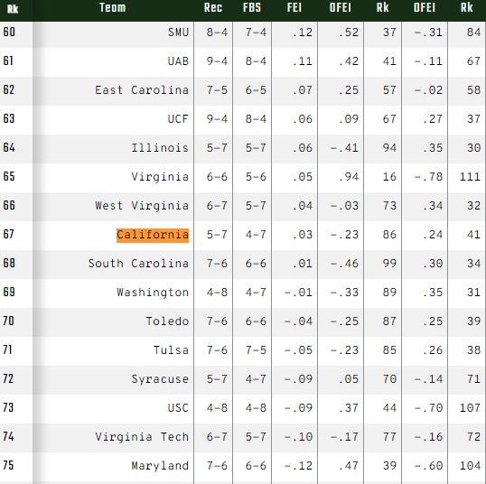 We can see here from 2021’s Football Outsider’s FEI ranking Cal was in the midst of ~.500 teams. Cal was 86th on offense and 41st on defense, and this averages out at 67th in the country out of 130 teams in the database. We can see here that there are plenty of bowl-level teams on the list, and is what we have hope Cal to be as the bare minimum.
