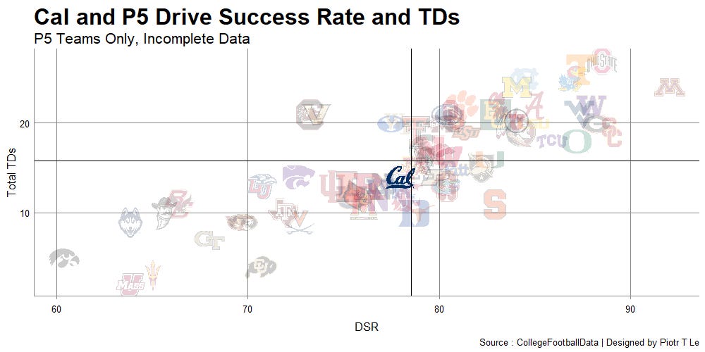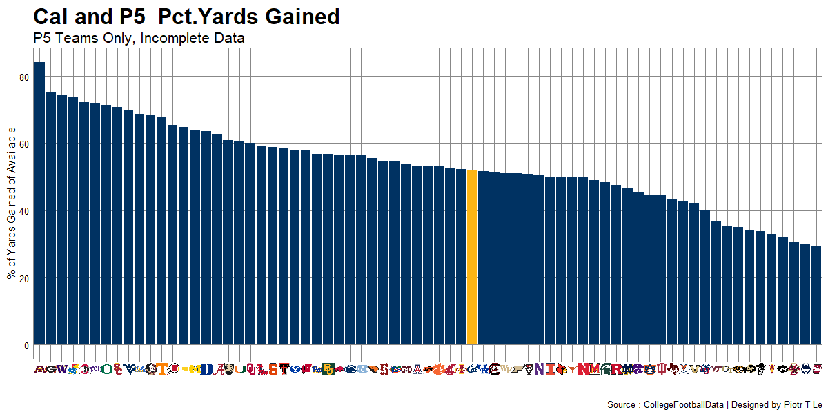 Here We look at a new measure: this calculates how many yards available Cal gets on average. That is if we start on the Cal 25 we have to drive 75 yards for a TD AKA 75 yards available which means that at a 52% of yards we on average gain 38 yards per drive. We fall slightly under the median and mean of the P5 here which could indicate a higher rate of 3rd and outs than our DSR predicts but I will look into this next week!