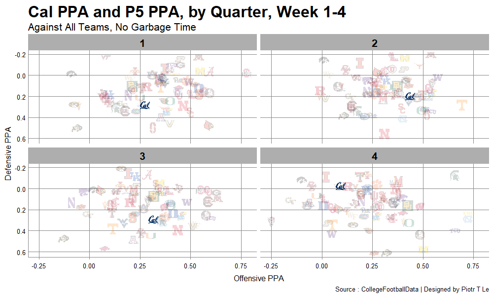 We can see here on a Q by Q basis the Cal remains roughly average with signs of life in Q2 and with the explosion of offense in Q3 against Arizona it helped our metrics there. The defense really shows its quality in Q4 with the offense trying itβs best not to be a liability. Is this the outcome of the defense continuously rotating in and out players? Or is it the benefit of Cal playing with a lead coming into Q4 and giving the defense better looks?