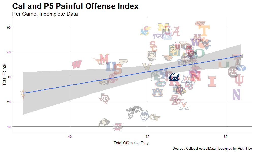 What makes for a painful offense? It is one that spends a lot of plays to score not a lot of points. It just feels more painful to spend 24 plays for a TD (Hi Colorado!) rather than 4! The line on the chart is a simple 2 variable regression with a CI. We can see here that Cal lies slightly under the line but not too far away from it. Weβre experiencing pain but it is a βI bit the inside of my mouthβ pain and not βExistential pain of reading your first book by Nietzsche and internalizing nihilism but not reading Camus for the absurdist solution as a high schoolerβ level of pain Northwestern suffers.