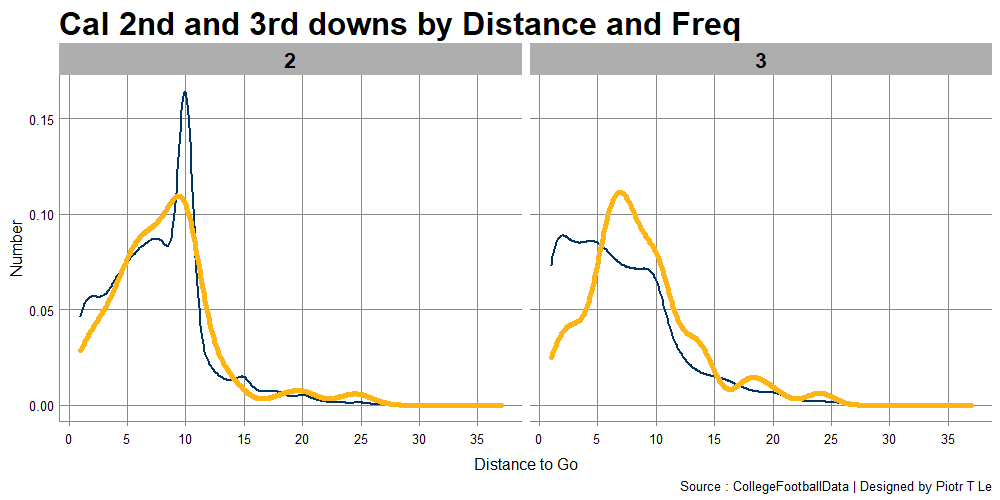 On the other side of the ball Cal remains in relative ennui on 1st down and comes to life in later downs. On 2nd downs we tend to have a more explosive offense with 3rd downs being forced to manufacture or die with a turnover on downs.