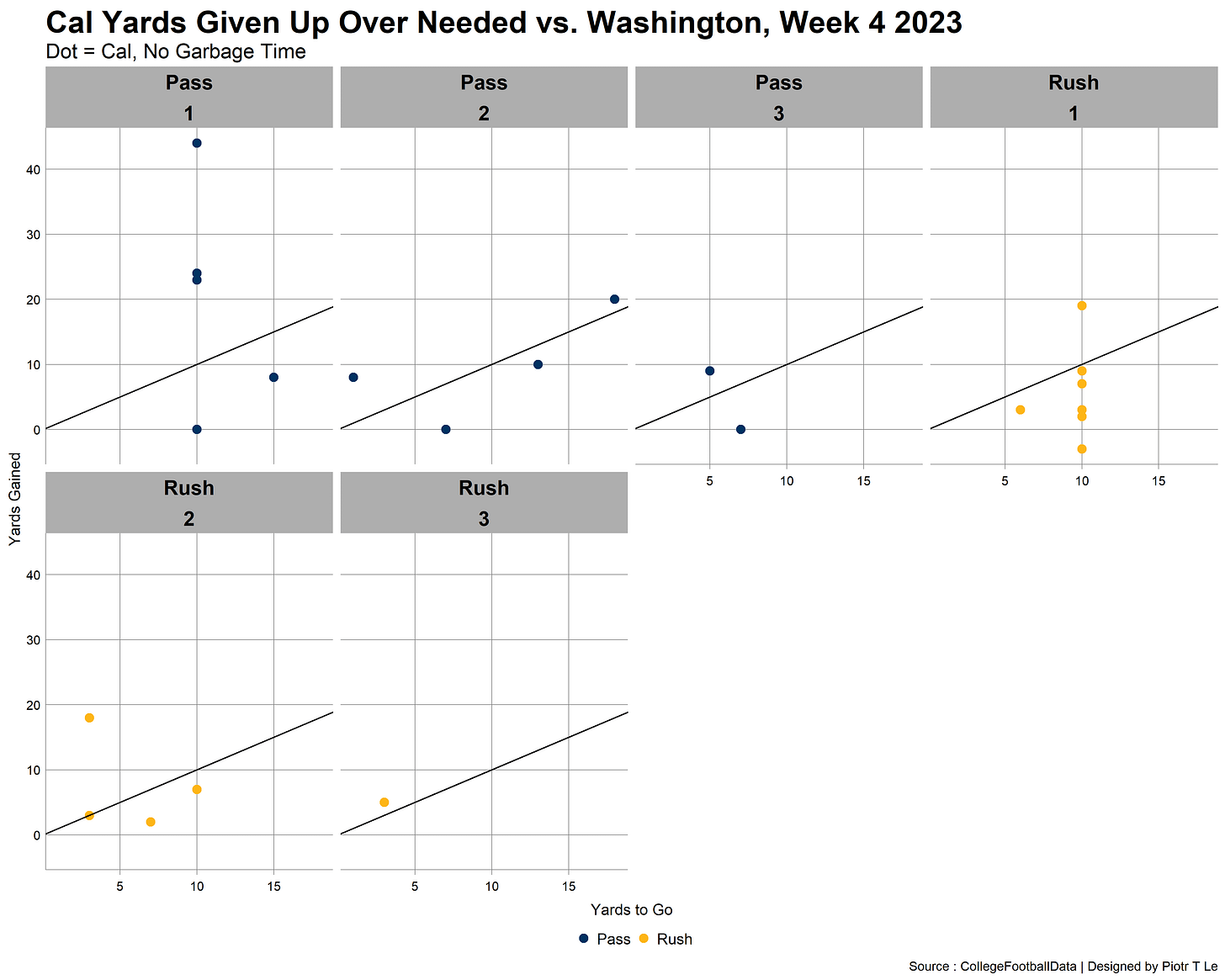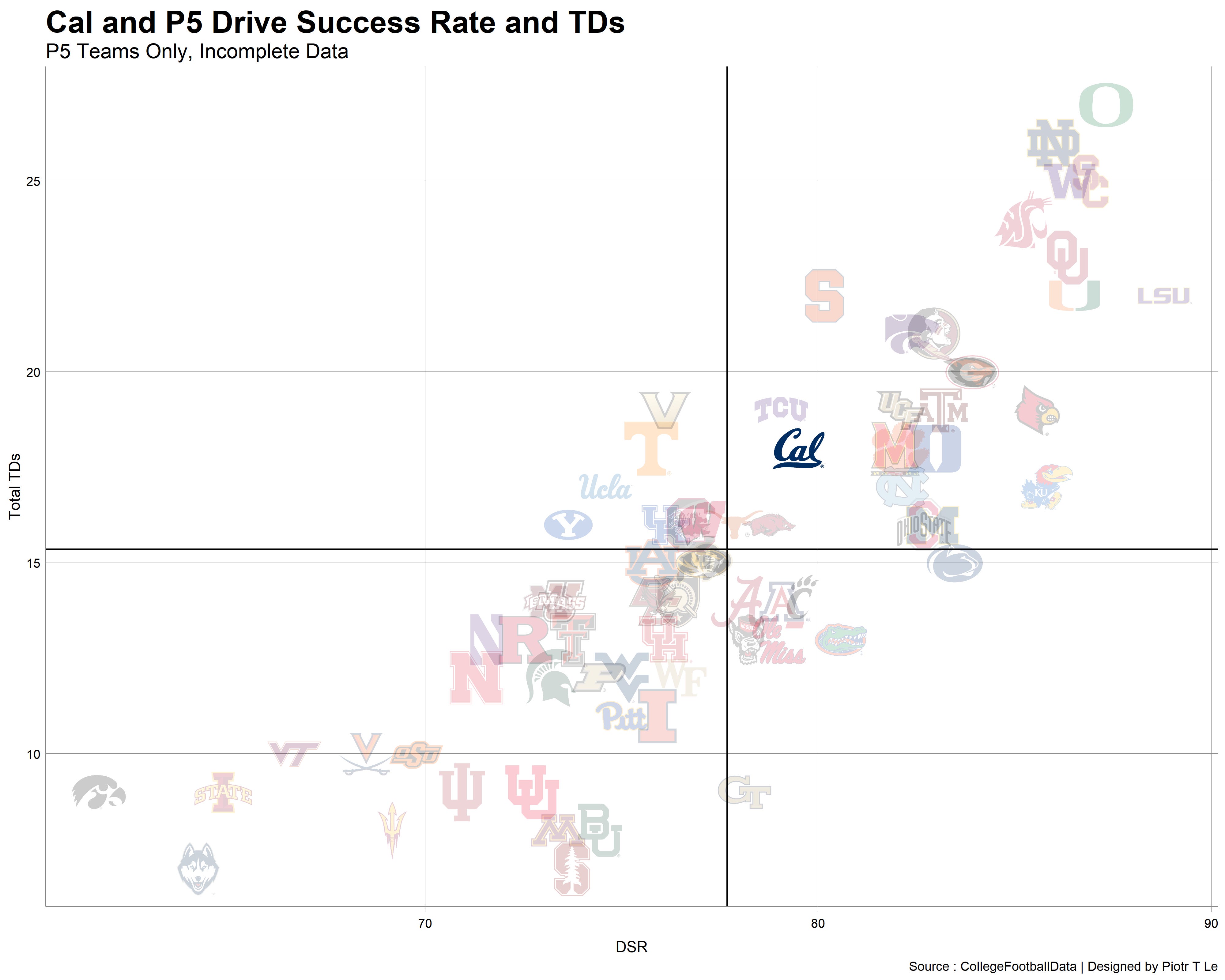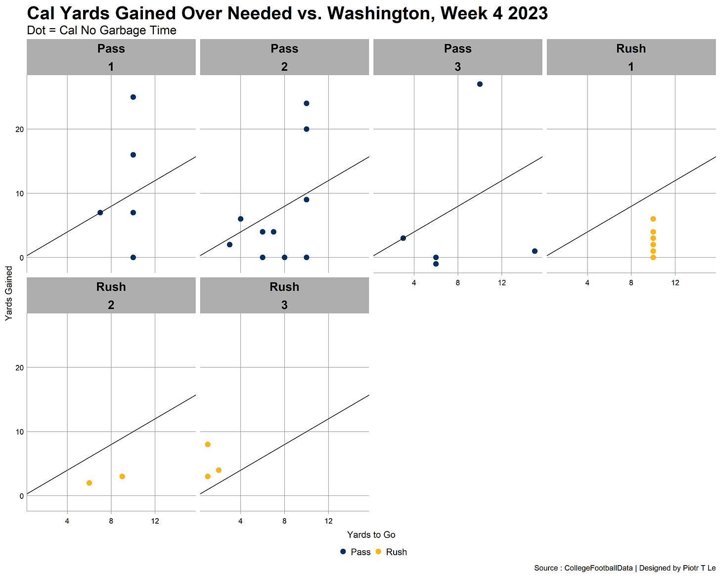 We only had 8 passes before garbage time that converted for a 1st down with only 3 runs doing so, all on 3rd and short. Otherwise it was a pretty dismal performance across the line We can see below Cal slowly creeping towards the line of being average at DSR note that this isn’t garbage time adjusted.