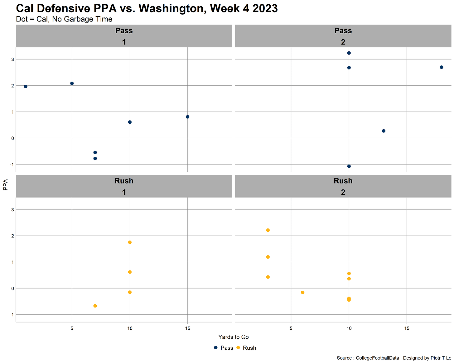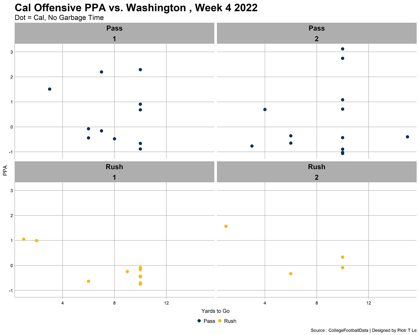 I am putting these charts in because it is not the data that needs to be scanned or analyzed. The beatdown by UW was so sever that we have no data after the 2nd quarter. That’s how severe the beat down was. Both the passing game on defense and offense were putrid, with the Cal offense yielding negative PPA/EPA on 13 passing plays in 1 half and forcing only 3 on defense.
