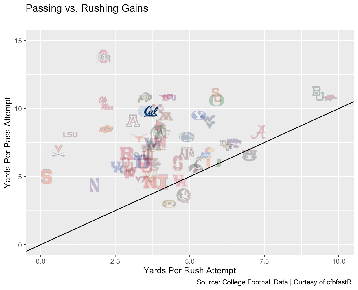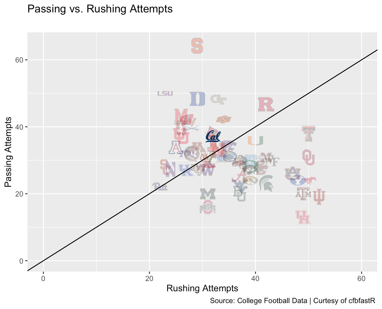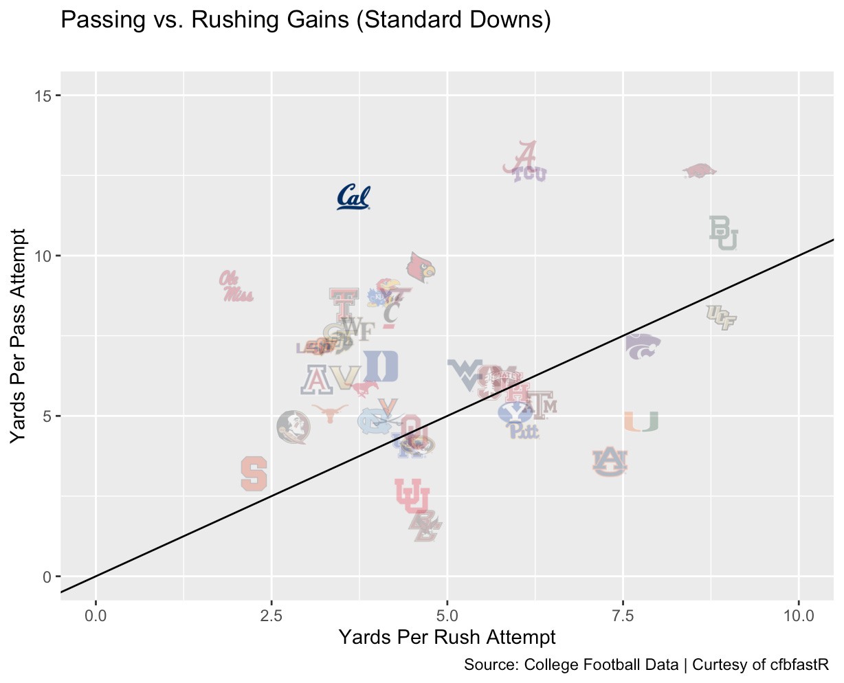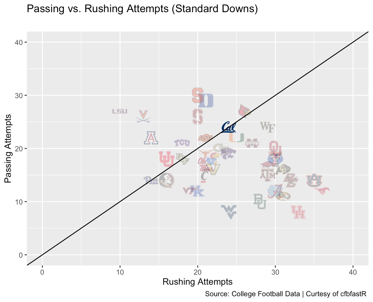 The same pattern holds focusing just on standard downs, where the offense can call either running or passing plays. Again, Cal’s rushing and passing attempts were more or less even (coinciding with the 45 degree line), while offensive production was even more imbalanced: Cal gained over 3 times as many yards per passing play as per rush attempt.