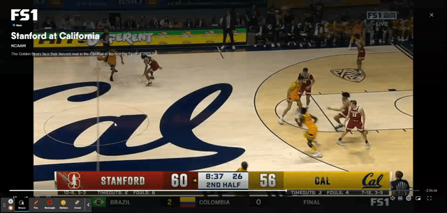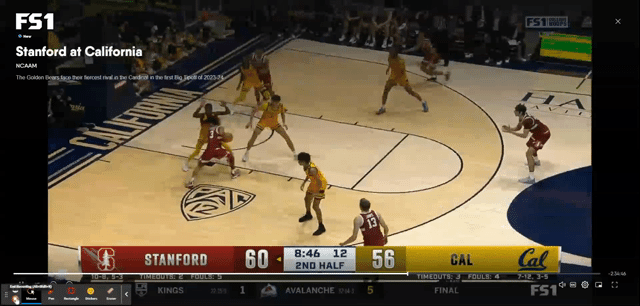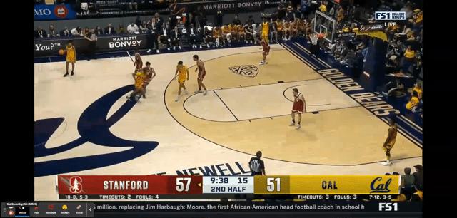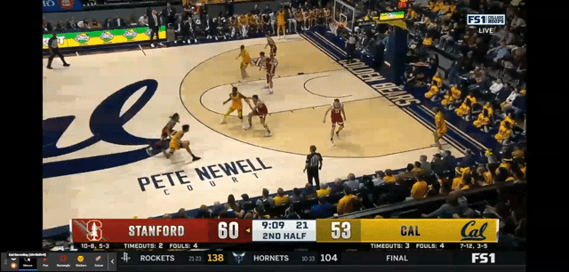 At 16:46 left in the game, Stanford had pushed their lead to ten after a Spencer Jones 3-pointer, 48-38. There is a sense of anxiety, and the half has not gotten off to a good start for the Bears. Cal goes on an 8-2 run, highlighted by the first of Keonte Kennedy’s breakaway steal and slam dunk. 50-46 lead for the Cardinal.