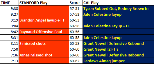 The story of Cal’s win over Stanford last Friday was Jalen Celestine’s and Grant Newell’s superlative play in the second half. In the moment, I did not realize just how dominant Celestine’s scoring streak was, and how much Grant Newell contributed at key moments. Being in person at Haas was exhilarating. My analytic synapses were being overridden by the emotions and excitement of the moment. I’ve watched the game again, and want to briefly highlight the key stretch of the second half.