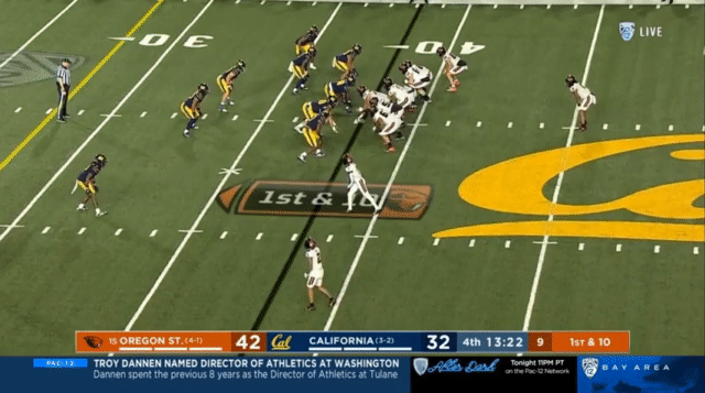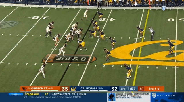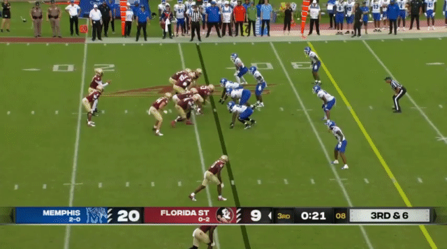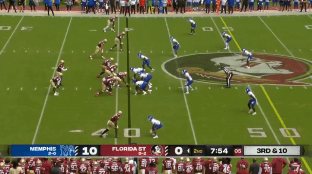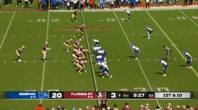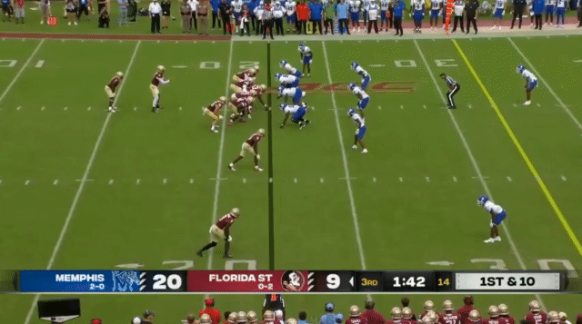 Cal fans saw firsthand last year just how good of a passer Uiagalelei can be when he lives up to that NFL potential, so let’s instead focus on what’s gone wrong for him so far this year. Uiagalelei is a rhythm passer— against Cal last year, he faced just 9 defensive pressures all game (0 QB hits, 0 sacks) on 25 dropbacks (36%), which gave Uiagalelei plenty of time to sit in the pocket and pick apart a strong Cal secondary. FSU’s opponent last week, Memphis, pressured Uiagalelei 20 times on 37 dropbacks (54%), with 4 sacks. The FSU offensive line hasn’t been able to protect Uiagalelei well enough to allow him to establish a rhythm the way Oregon State’s offensive line did (and to be fair, I don’t think many people realize how good Oregon State’s offensive line was— the right tackle, Taliese Fuaga, was a 1st round NFL Draft pick).