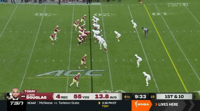 FSU’s top return wide receiver is the slot receiver, Ja’Khi Douglas ( a former running back). Although he’s a bit undersized, he has good speed and play-making ability, and hence FSU will try to get Douglas the ball in open space (e.g. on a jet sweep, etc). Here he shows some of that speed: