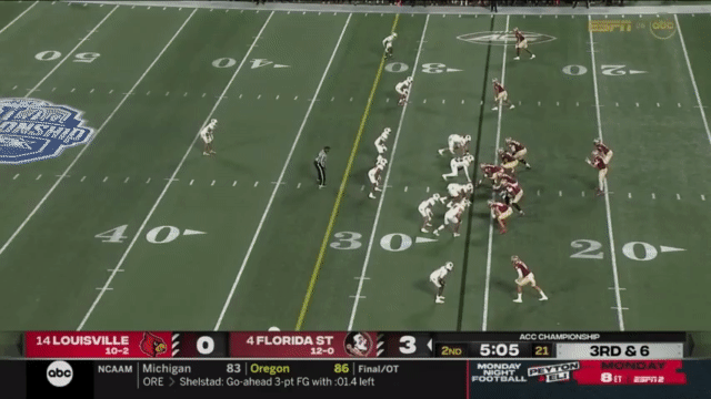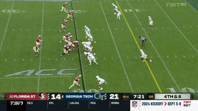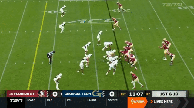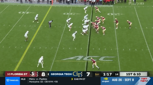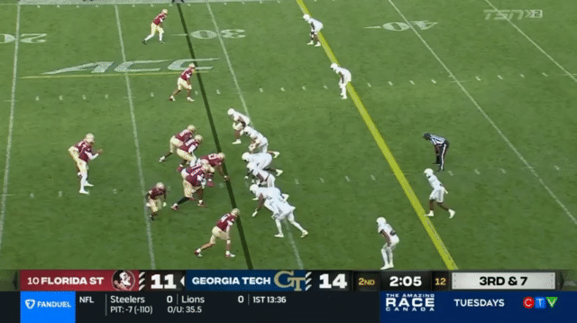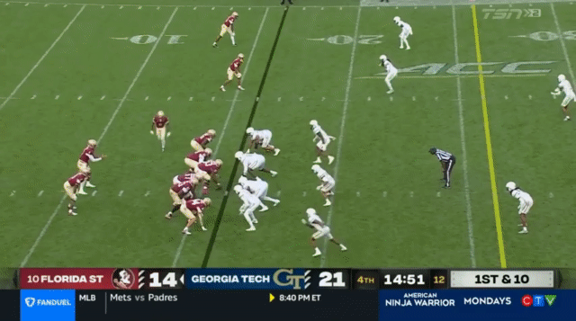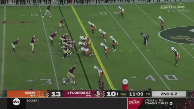 In case it wasn’t clear from previous clips, but the tight end Kyle Morlock has really struggled with drops. I’m presuming it’s just a slump he’s in, but I watched FSU’s last 5 games and have never seen so many drops in such a stretch. It feels like mental mistakes—turning to run before finishing the catch, and then getting in your own head about drops just makes the problem worse, etc. Even so, Morlock has not been a particularly adept route runner either, another drawback for a pass-catching TE.