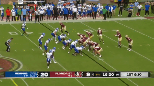 FSU is led by Oregon State transfer QB DJ Uiagalelei. Right now he’s receiving a disproportionate amount of the blame for the FSU offense, and although he does deserve his share of criticism (and we’ll get to that in a bit), FSU is suffering a complete breakdown of the offense. They currently rank 128th out of 133 FBS teams in total offense, and it starts with a failure to get the run game going. The offensive line gets beaten, misses blocks, and sometimes just runs plays that are schematically doomed to failure. It doesn’t matter who FSU has in the backfield; a lot of their run plays are doomed to failure, which is why FSU is 2nd to last in the FBS in rushing offense, averaging a mere 52.0 yards/game.