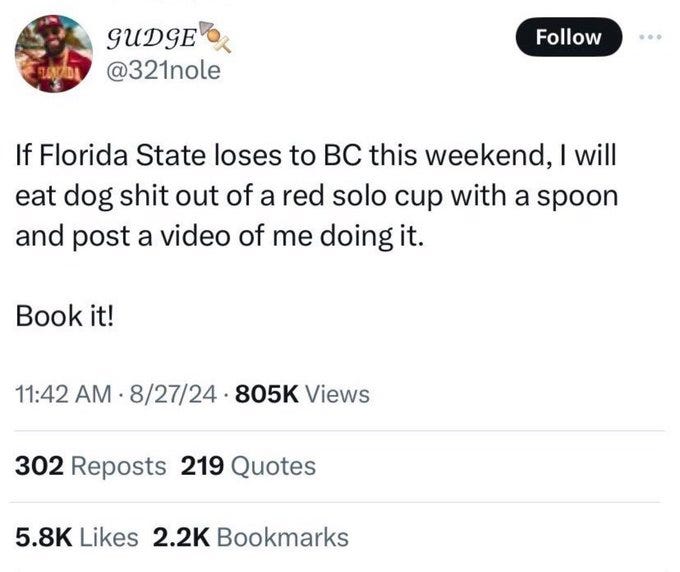 This post caught national attention even as the FSU fan declined to follow through. His profile pic is an obviously AI-generated image (and hence he was never going to follow through on this ‘bet’ anyway), and I’ll give you 3 guess as to why an FSU fan would want to create a fake account disconnected from his real identity. FSU has not won a game since, and many people are saying that this could be the curse of “FSPoo”, that FSU is doomed to lose until this FSU fan follows through on his poo bet.