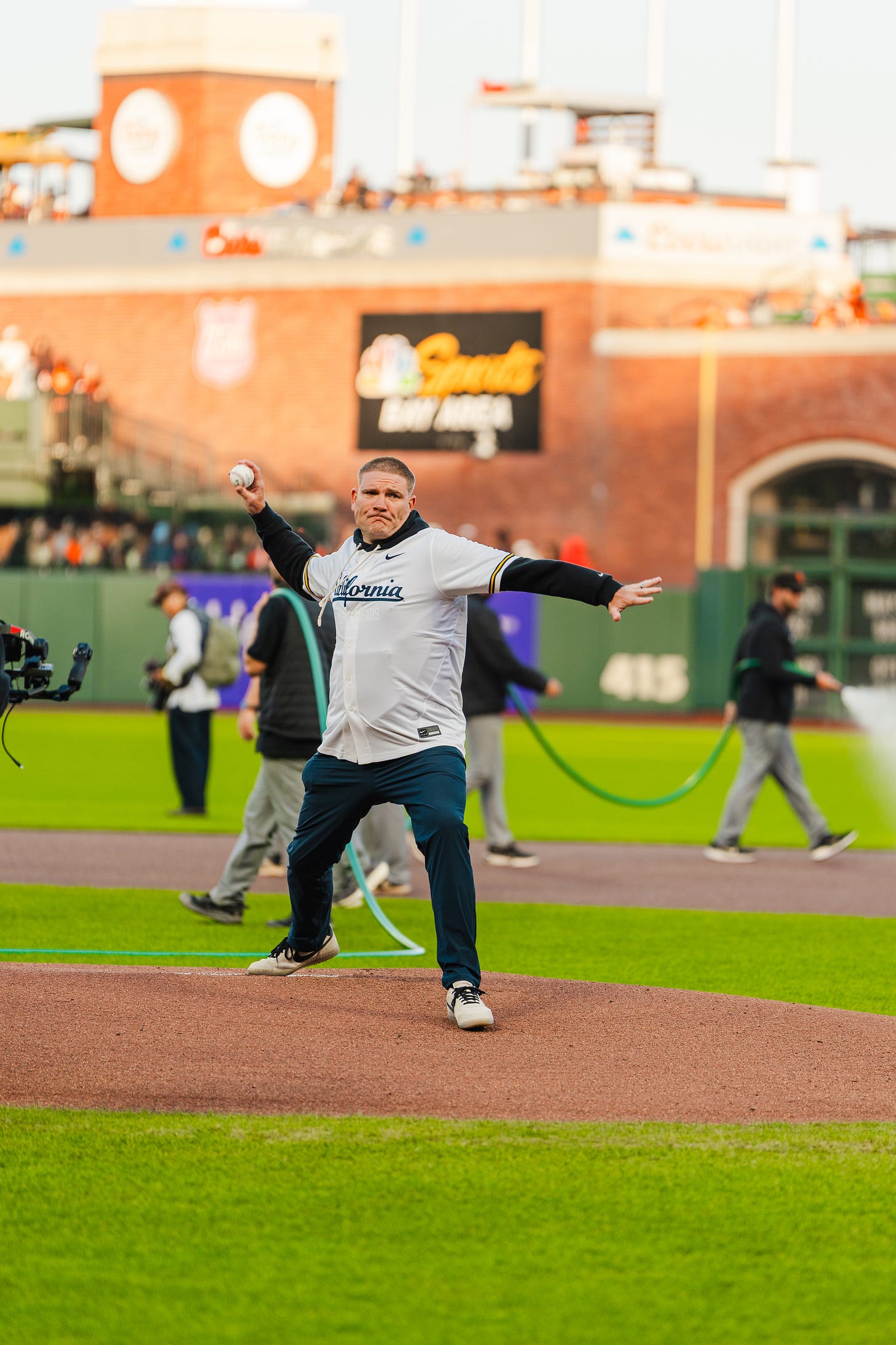 As the crowd ate that up, it was Fletcher and Hendricks’ turn to take the stage. The two transfers made their way to the lineup exchange with San Francisco Giants manager Tony Vitello, while their college football career accolades were listed for all to see in the stadium. JKS closed out the pregame routine with his rendition of play ball, capping off the Golden Bear parade in the city by the bay.