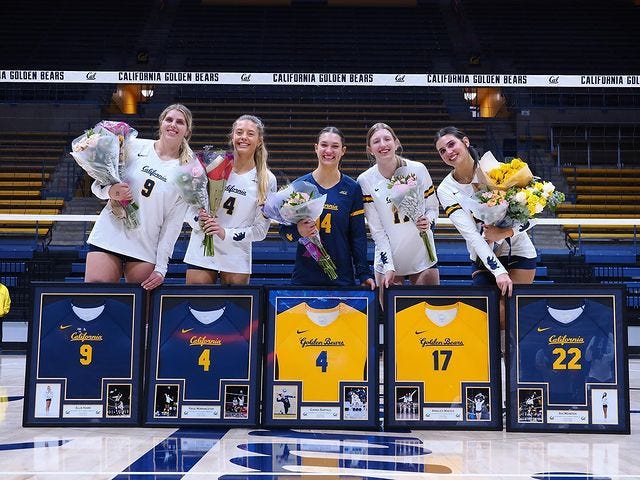 Cal Volleyball recognized their 5 graduating seniors. Congrats Paige Morningstart, Gianna Bartalo, Ellie Hamm, Annalea Maeder, and Ava Mehrten!