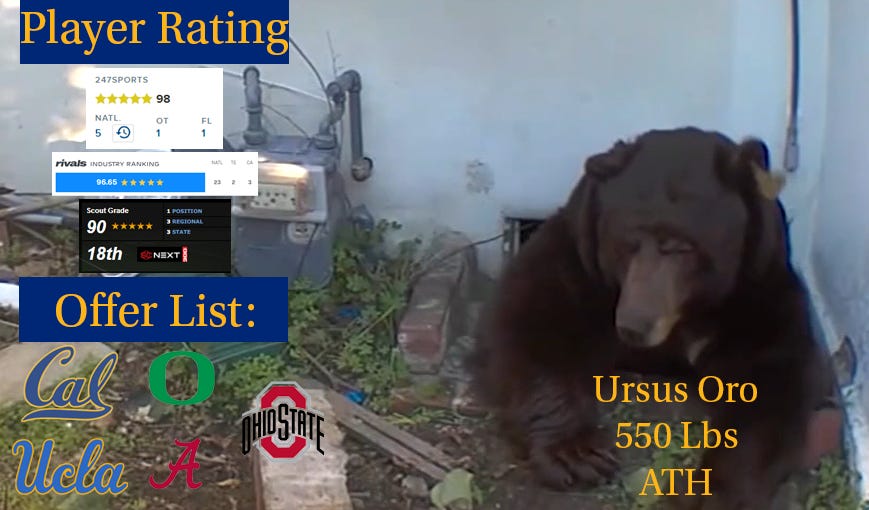 And boy has that worked out for him. Ursus Oro gained approximately 25 more pounds of muscle and was found denned up in the crawl space of another Altadena home this past week. The bear is currently considering his options (whether or not to move out) while also mulling where he’ll play college football. Industry insiders thought he was heading to Westwood this fall, but the hiring of Tosh Lupoi has added a new wrinkle to his recruitment. Ursus Oro is also receiving interest from Oregon, Ohio State, and Alabama.