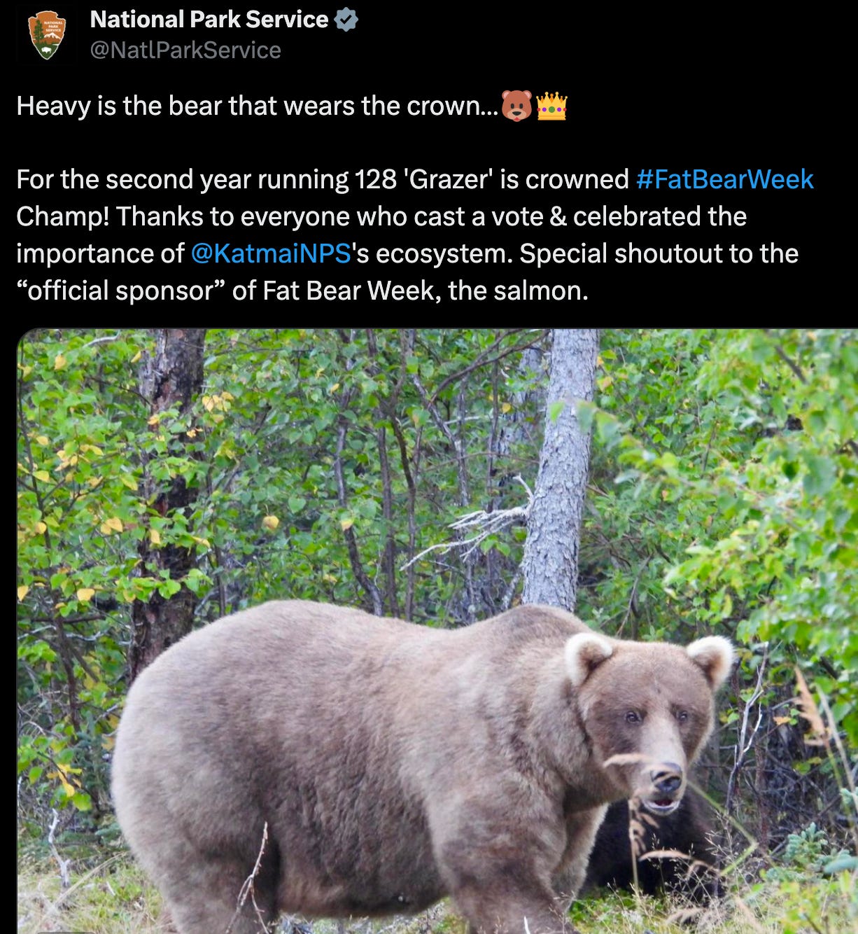 Because the universe is cosmically aligned, Fat Bear Week, the annual celebration of our beautiful prepper bears began last week and concluded Tuesday October 8th where Grazer was declared the victor. God I love the internet.