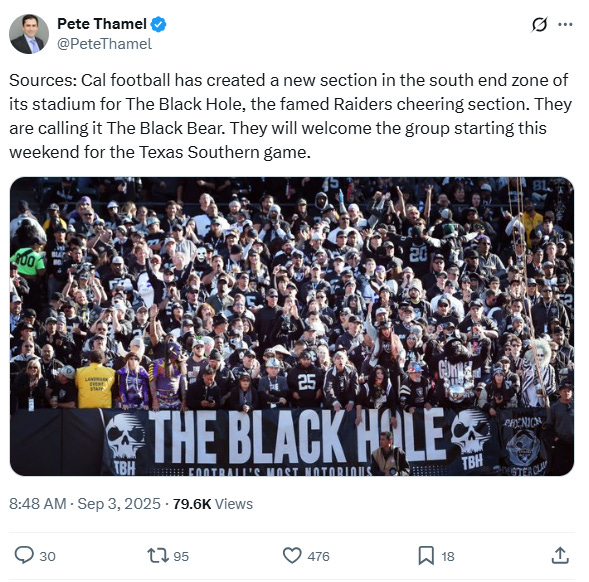 Early Wednesday morning, word broke of a new seating section at California Memorial Stadium aptly named, the Black Bear that aims to recreate the famed Raiders cheering section, the Black Hole. Calgorithm detectives found that it will be in Section KK and making its first appearance this weekend when Cal takes on Texas Southern. Can’t wait to see it in action. Until then…