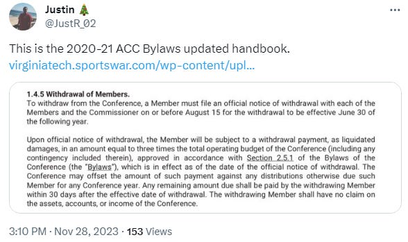 What is the likelihood of this happening, however? Is it just usual X idiocy or is there something more to this. To better understand this, I went straight to the source, the ACC contract documents. We have to determine exactly how these ACC teams relate to each other contractually and, most importantly, what happens if they try to leave to go to the Big10 or SEC etc. The bottom line is the ACC ain’t going nowhere anytime soon!
