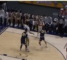 Credit also has to go to Jalen Cone’s initial defender, UCSD’s Hayden Gray (#10). He puts in so much work throughout the entire sequence, and does a great job of fighting through all the motion and staying connected with Cone. In the end, Jalen Celestine’s defender bailed on Celestine to pressure Cone, leaving Celestine wide open.