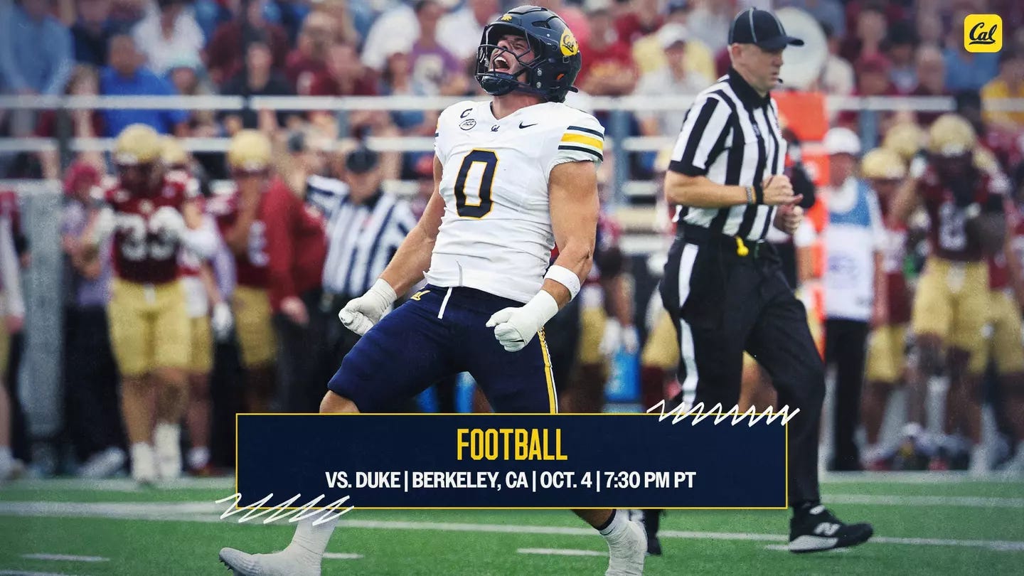 The California Golden Bears (4-1, 1-0 ACC) host the Duke Blue Devils (3-2, 2-0 ACC) for homecoming. The Saturday night match-up is only the third time these two teams will have met since their home-and-home games in 1962 and 1963.