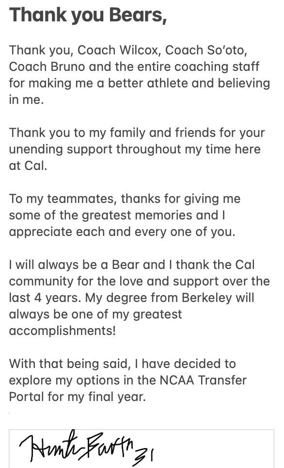 The turmoil of the transfer portal continues to strike. Potential starting linebacker Hunter Barth is on his way to **exasperated sigh** Stanford. Here was his transfer portal message saying farewell to Cal fans.