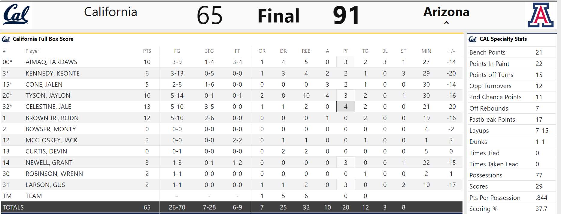 Cal shot 37% for the game, including 7-of-28 from 3-point range. Jaylon Tyson played 30 minutes after missing the last 10 minutes of Saturday’s game with cramps. He finished with 10 points and 10 rebounds.