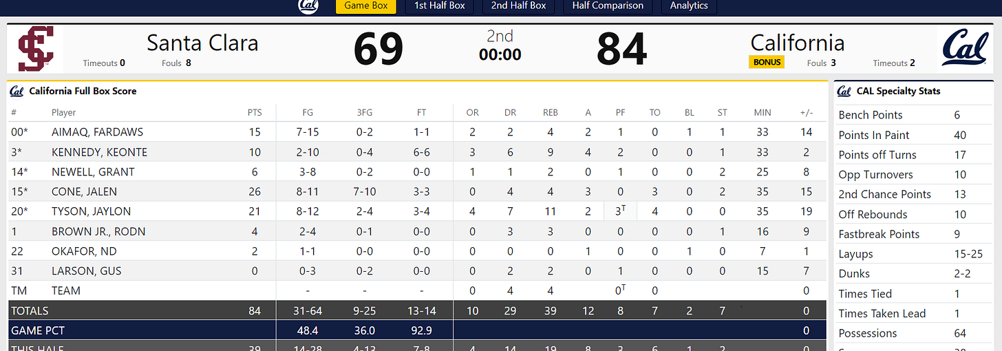 Great win. Santa Clara has some nice wins. They were missing a key piece, but Cal was missing 2.