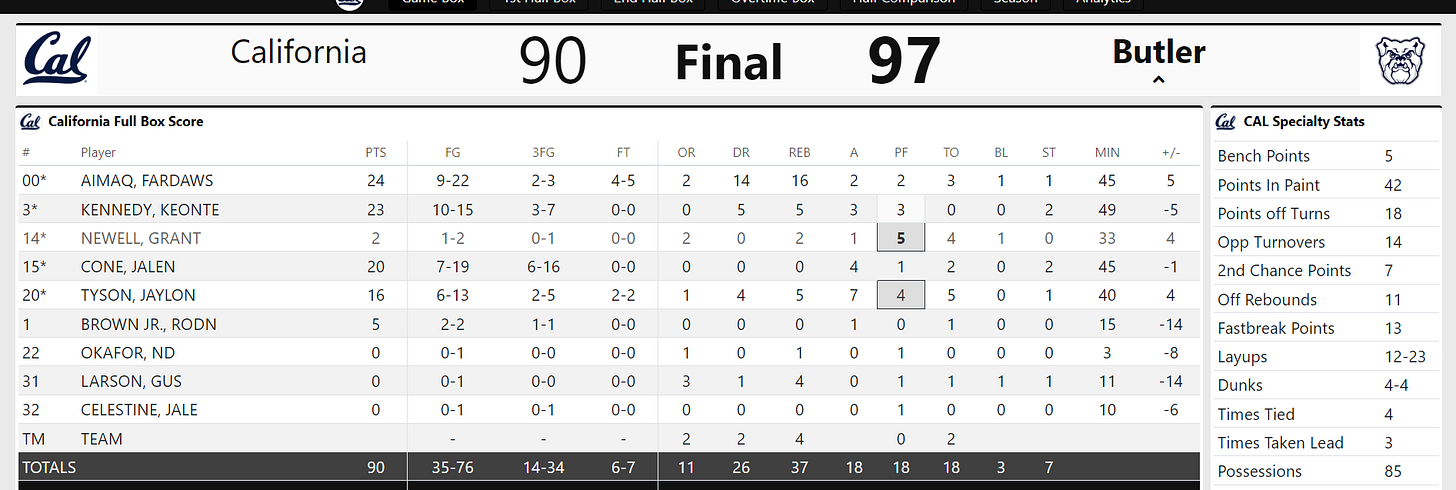 Butler dominated the second overtime. Grant Newell fouled with 3:23 left, leaving Cal without a strong defensive presence. After that, Butler outscored Cal 10-5.