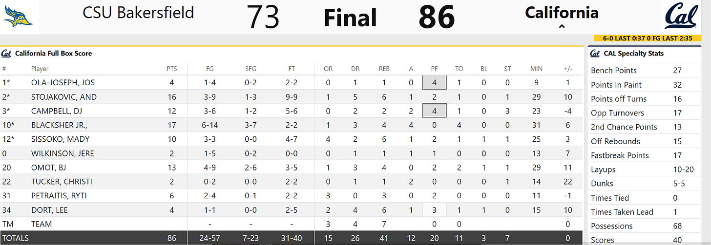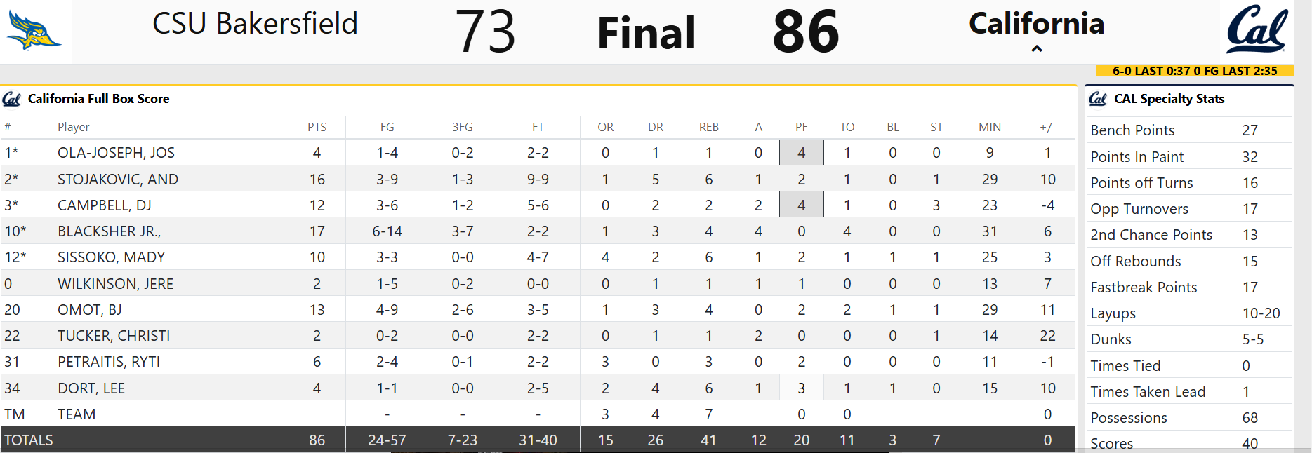 Early in the second half, Bakersfield started chipping away at the lead and was able to get it to 11 points with around 13 minutes to go. The Bears were sloppy with the ball, committing 6 turnovers during this stretch. Cal kept their composure, and maintained a double digit lead. Bakersfield employed a full court press on defense around the 10-minute mark. The pressure forced Cal into a couple turnovers, but Bakersfield could not take full advantage. Bakersfield was able to cut the lead to 8 with just over a minute remaining. After Mady Sissoko made 1-of-2 free throws, Bakersfield made their next basket to cut the lead to 7. Christian Tucker, Andrej Stojakovic, Jovan Blacksher Jr. and DeJuan Campbell each added 2 free throws down the stretch to secure the win.