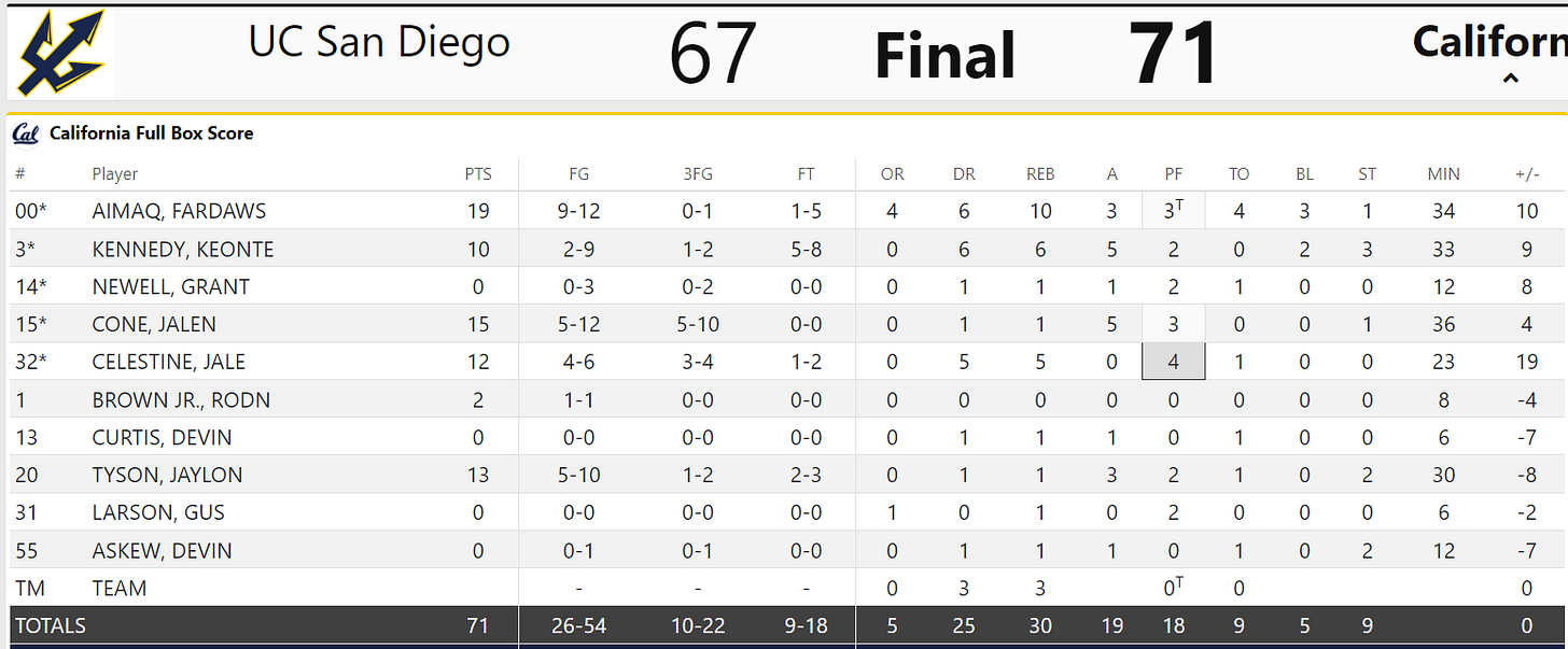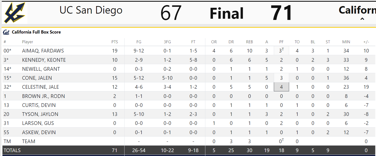 The teams traded baskets, and UCSD would get to within 1 point after a layup by Aniwaniwa Tait-Jones made it 68-67 Cal with :22 left. Keonte Kennedy made 2 free throws, and Jalen Celestine made 1-of-2 at the end, to give Cal the final 71-67 win.