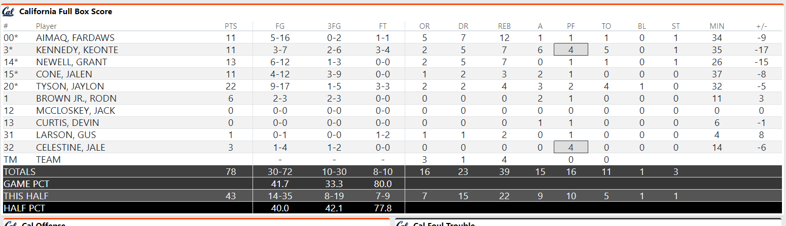 Ole Miss displayed excellent ball motion through the contest, compiling 21 assists against just 8 turnovers. They shot 52% for the game, including 58% from 3-point range (12 of 21). The lead grew as large as 24 points midway through the second half. Cal continued to battle and managed to get the lead down to 8 points with just under 1 minute remaining. Ole Miss would convert their free throws and come away with the 10-point win.