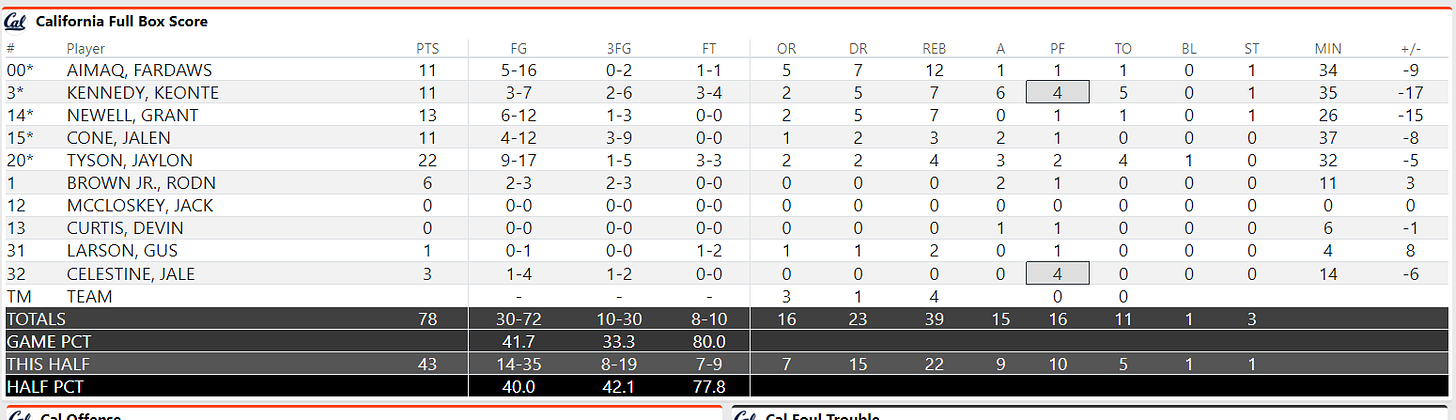 The Rebels’ Jaemyn Breakfield scored a season high 27 points, including 5-of-7 from long range. Cal was led by Jaylon Tyson’s 22 points. Devin Curtis played 6 minutes, his first acion of the season. The season plan was to redshirt Curtis, but ND Okafor’s ankle injury pressed Curtis into playing time.