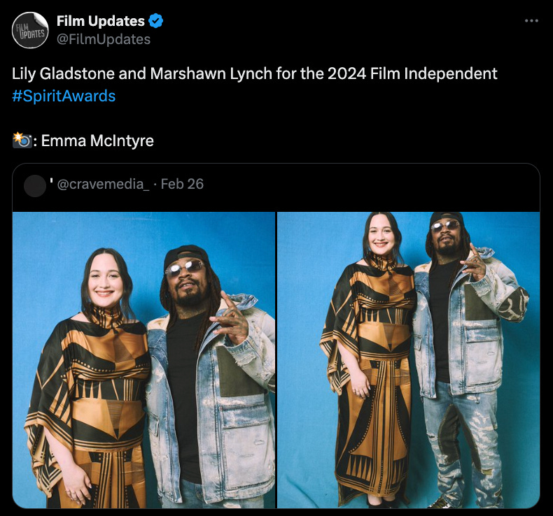 Finally, here is film star and Cal legend Marshawn Lynch with Killers of the Flower Moon star Lily Gladstone at the Independent Spirit Awards. Just two celebrities focused on uplifting their communities.