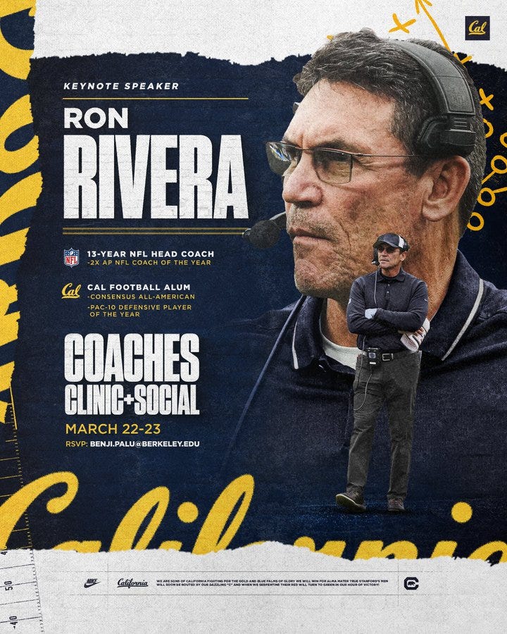 Ron Rivera will be coming back to Berkeley! (To give a talk at the Cal Coaches Clinic + Social.)